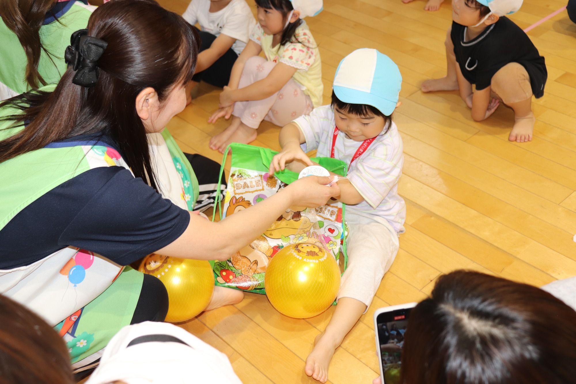 猛暑による園庭での活動自粛などにより、昨年まで行っていた夕涼み会に代わり、今年度より夏期保育中にぶんか夏まつりを室内・ホールで行うことになりました。各教室やホールで盆踊りを踊り、各学年ごとホールに集まると待ちに待ったワクワクの輪投げやヨーヨー釣り!! お買い物ごっこをしながら楽しみます。みんなかわいいおもちゃやヨーヨーをGETしました!\(^_^)/ 子どもたちも夏まつり係りの保護者の皆さんもニコニコ笑顔で楽しい時間を過ごしました(^_^)v