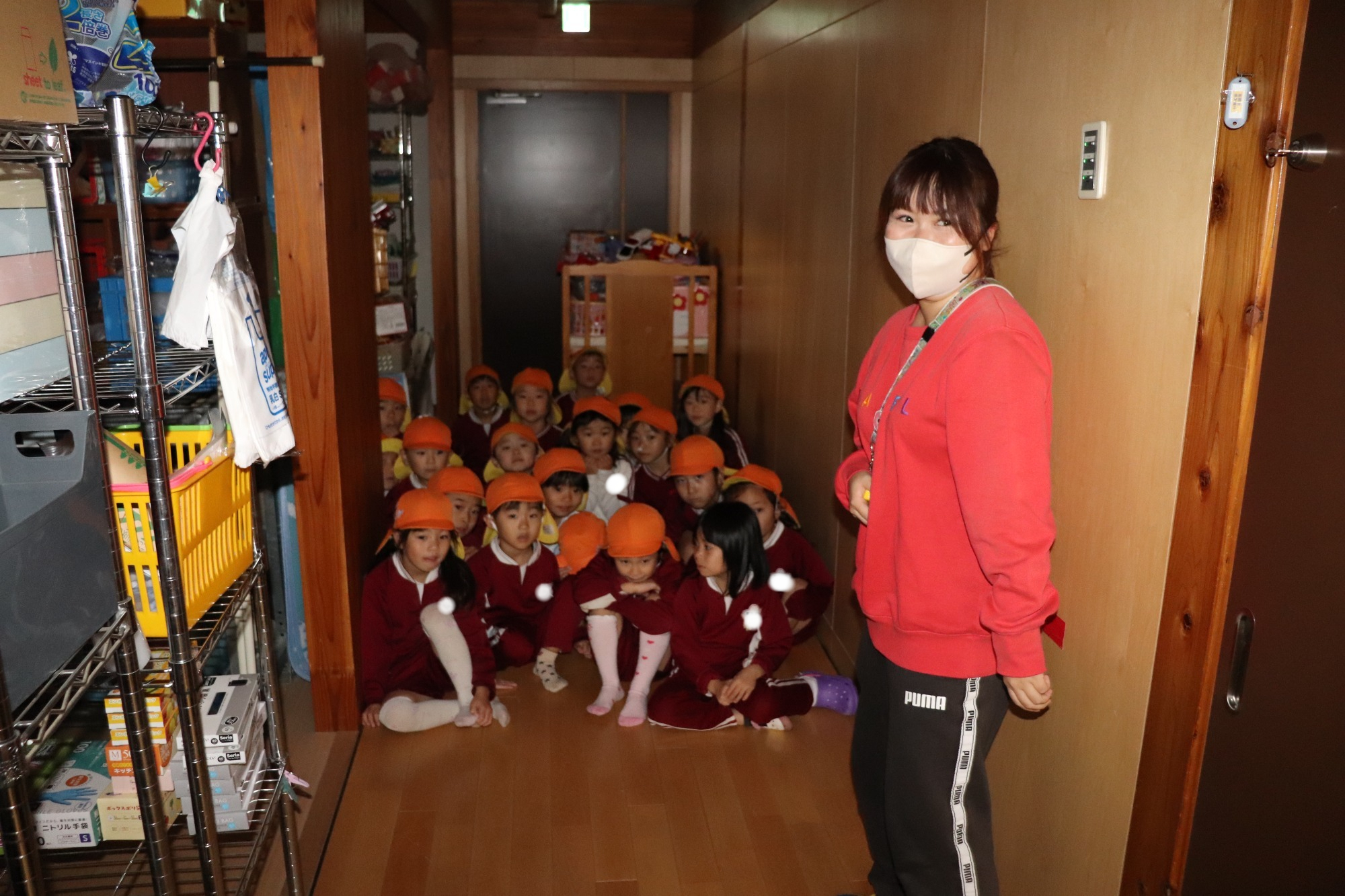 22日(金)全園児での防災訓練を行いました。今回は給食調理室からの火災を想定し、おさない・かけない・しゃべらない・もどらないを守りながら安全に素早く園庭へ避難することができました。園長先生のお話後、たくみ先生から火災時の注意事項や消火器の使用方法などのお話があり、水消火器を使用して消火訓練も行いました。いざという時のために日頃から備えておくことがとても大切ですね!