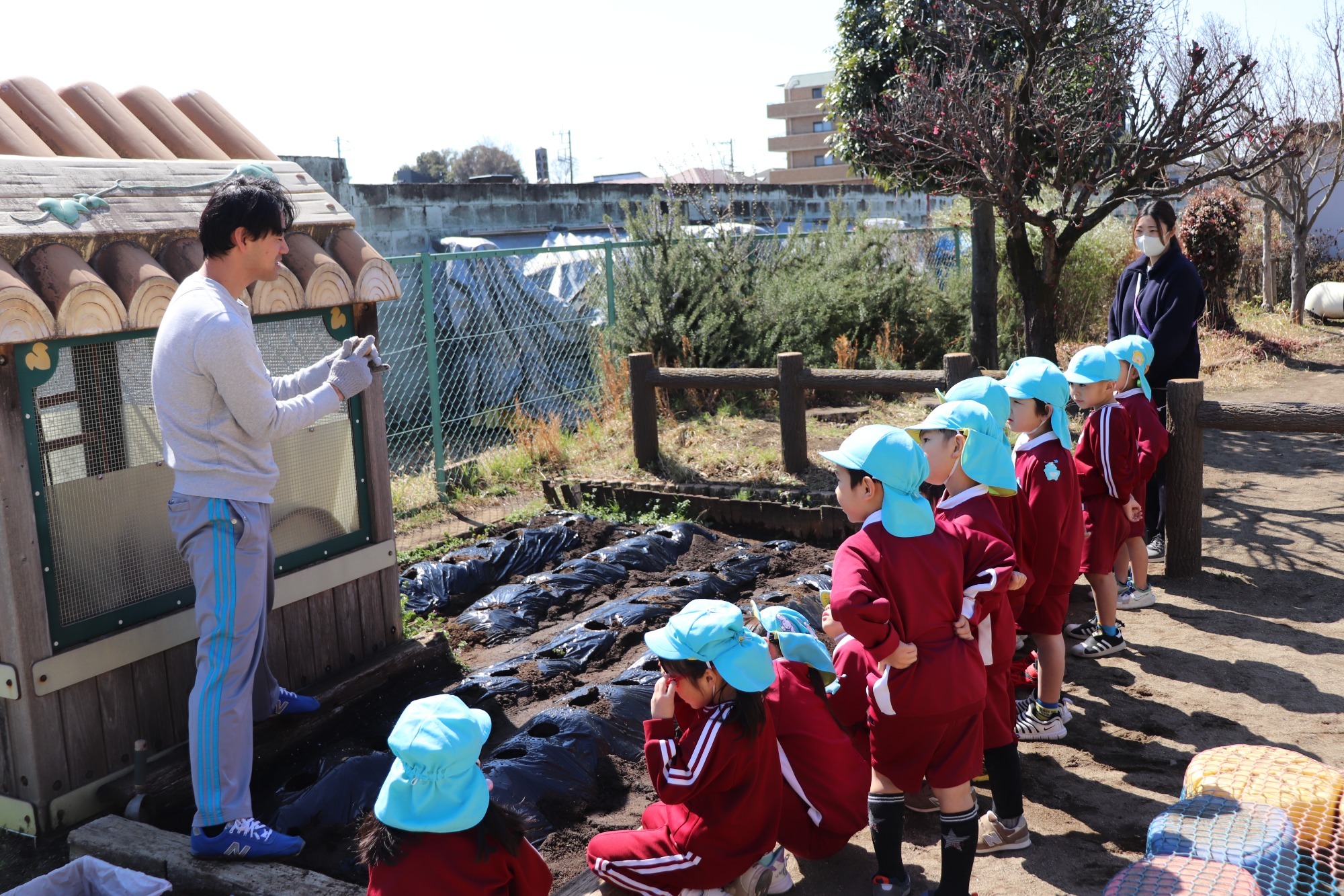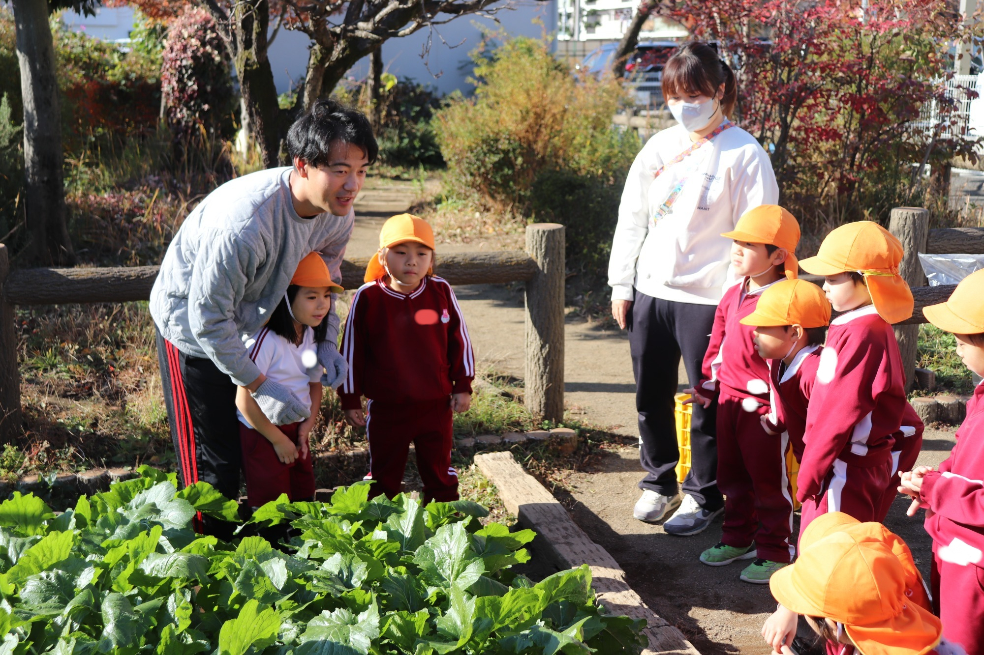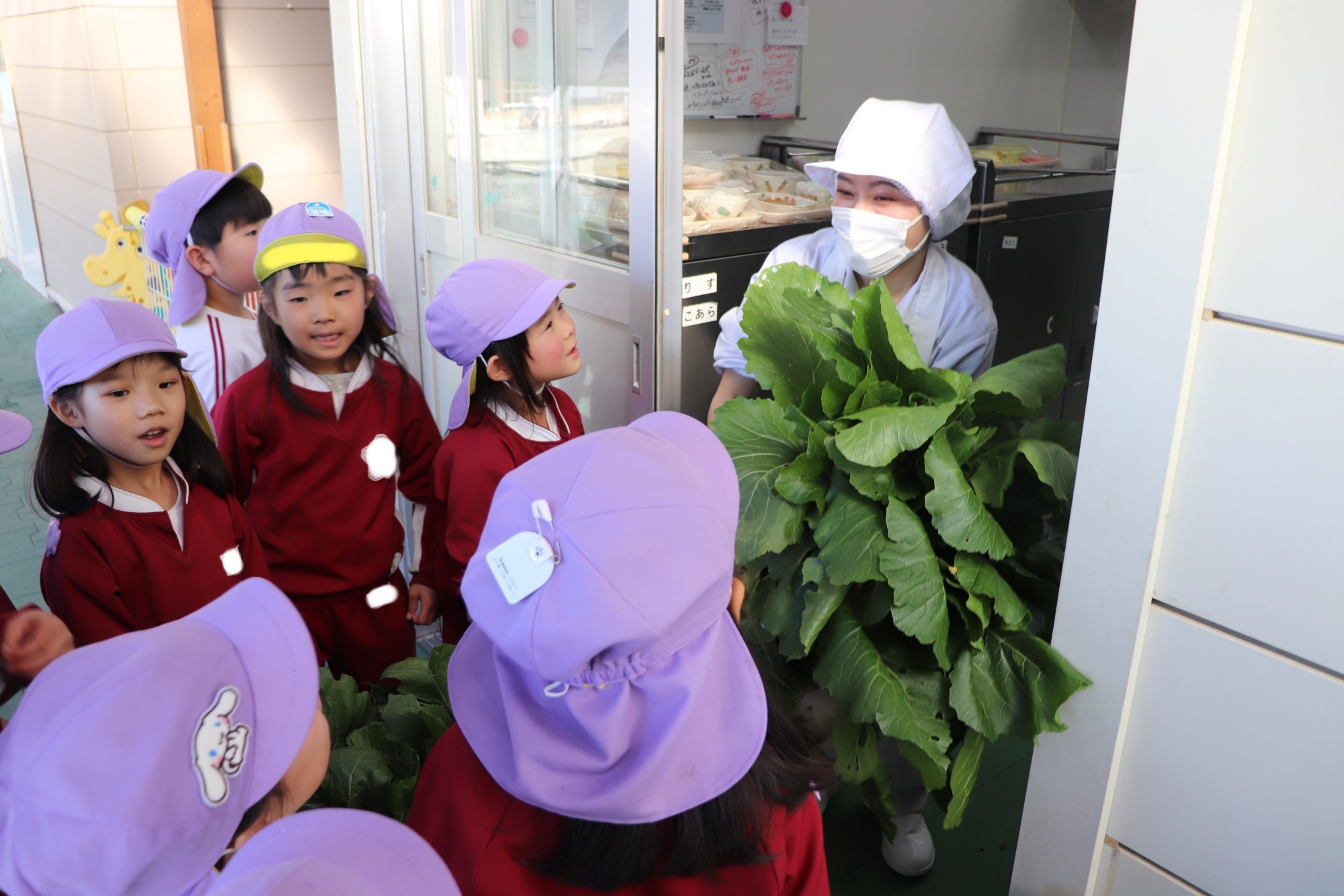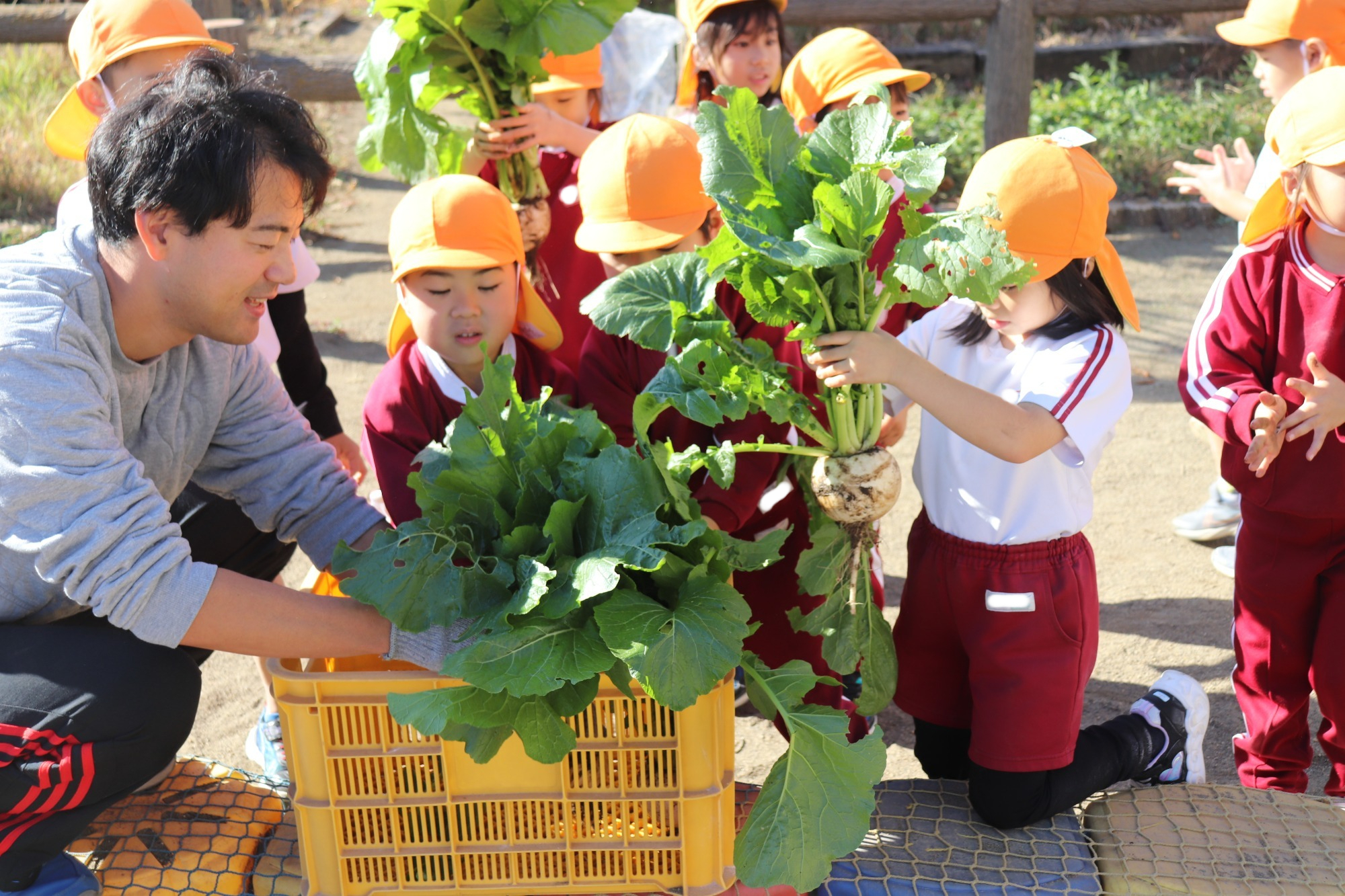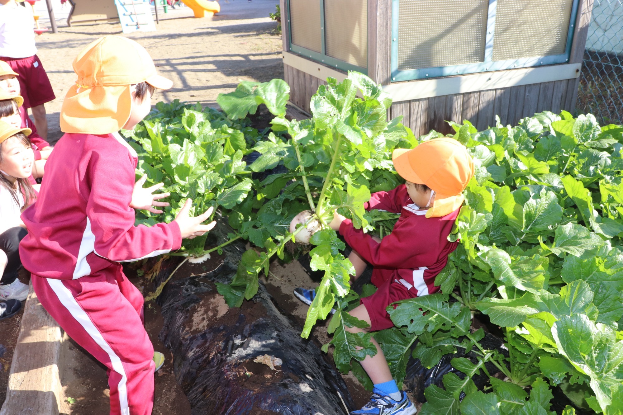 年長さんが9月にカブの種まきをしてから4ヶ月が経ち、いよいよ収穫の時期を迎えました。日が経つにつれ緑の葉がぐんぐん大きく繁り、白いカブが顔を出しています。子どもたちは大小様々な大きさのカブを「うんとこしょ~どっこいしょ!!」と声を上げながら勢いよく抜いていきます! そして、たくさんのカブをコンテナBOXに詰め込み、みんなで誇らしげに調理室まで運びました(^_^)v 自分たちで頑張って育て収穫したカブは、お味噌汁の美味しい具になり、全園児でおなかいっぱいいただきました\(^_^)/