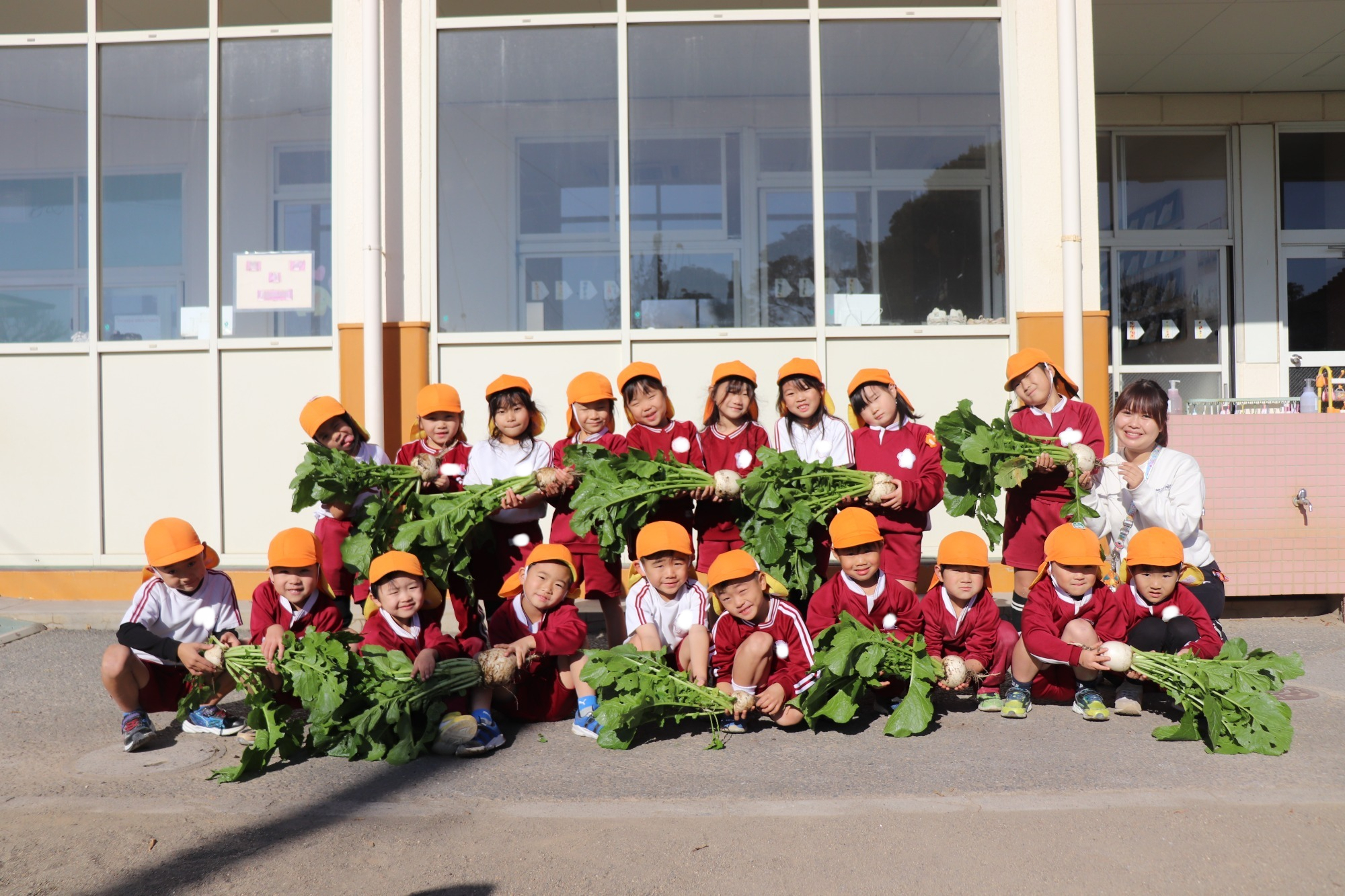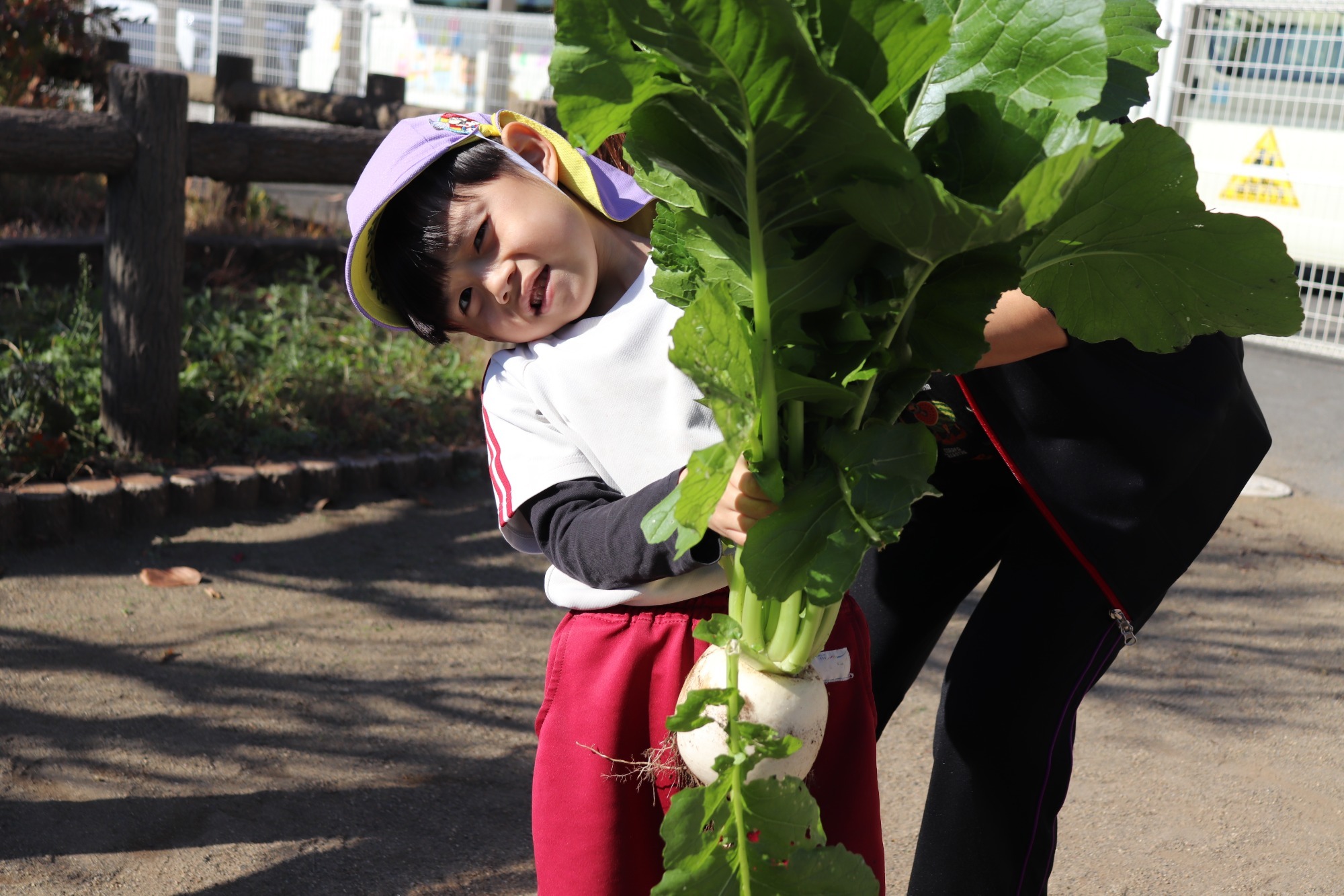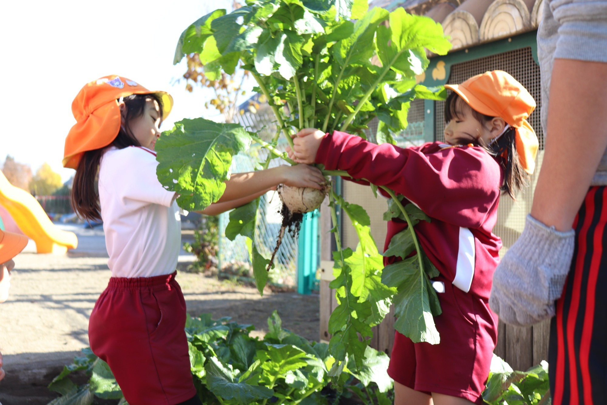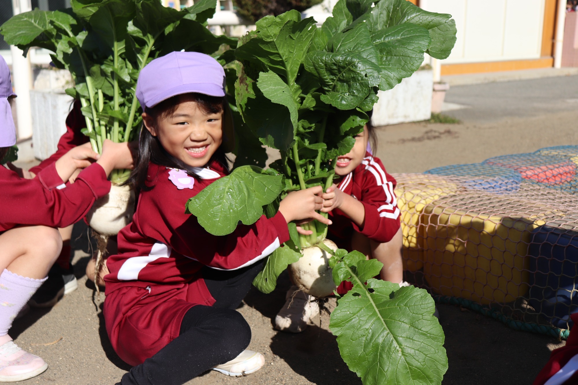 年長さんが9月に種まきしたカブがすくすくと大きく育ち、いよいよ収穫の時期を迎えました! 毎日お水をあげたり、雑草や虫を取り除いたりしながら大切に育ててきました! 今年は大きなカブが多く、「うんとこしょ!どっこいしょ!!」と大きなかけ声をかけながら力いっぱい引き抜きます!! 収穫したカブは子どもたちが給食調理室まで運び、調理員さんに調理をお願いしました(^_^)v 美味しい給食をお楽しみに~♪