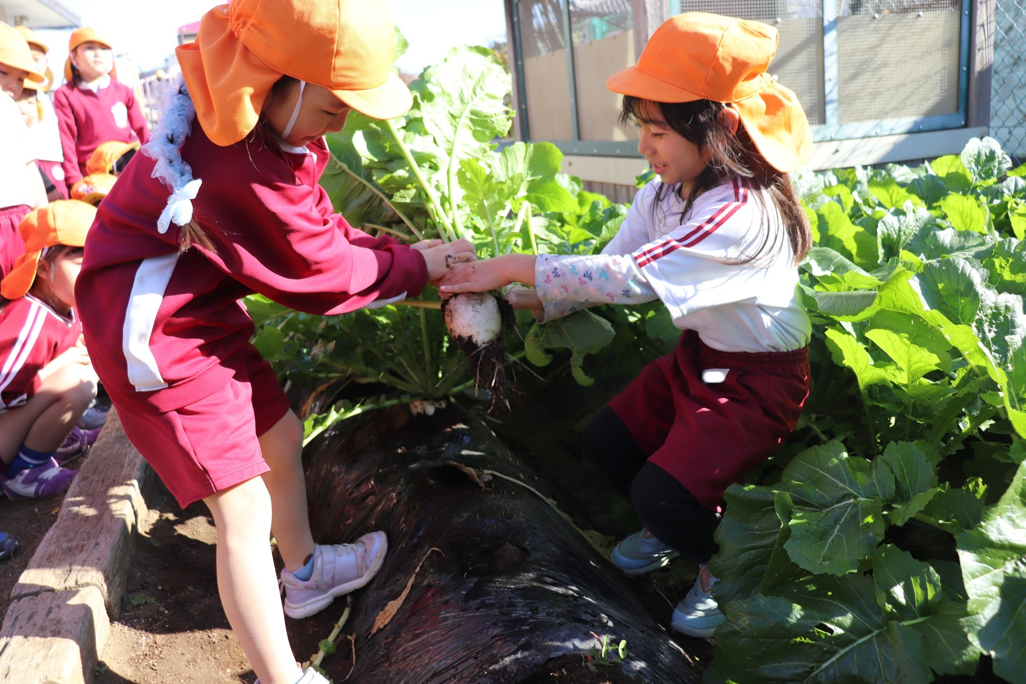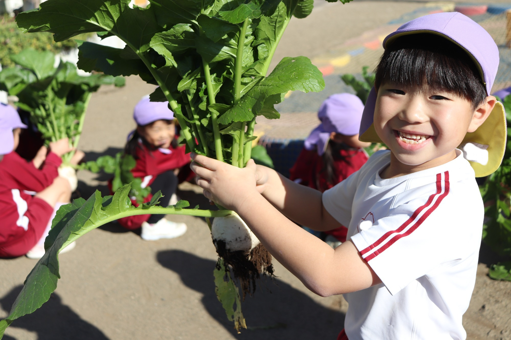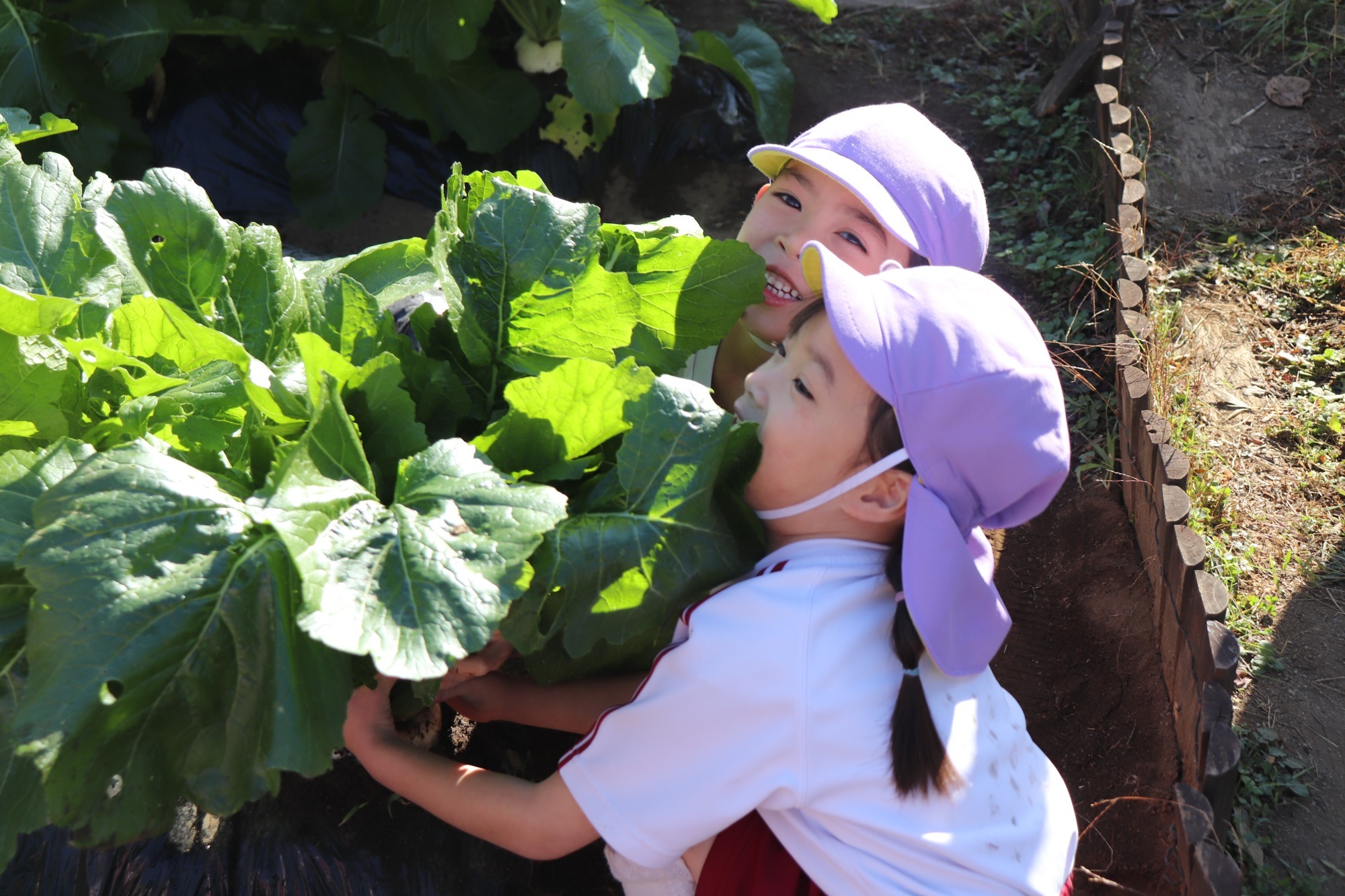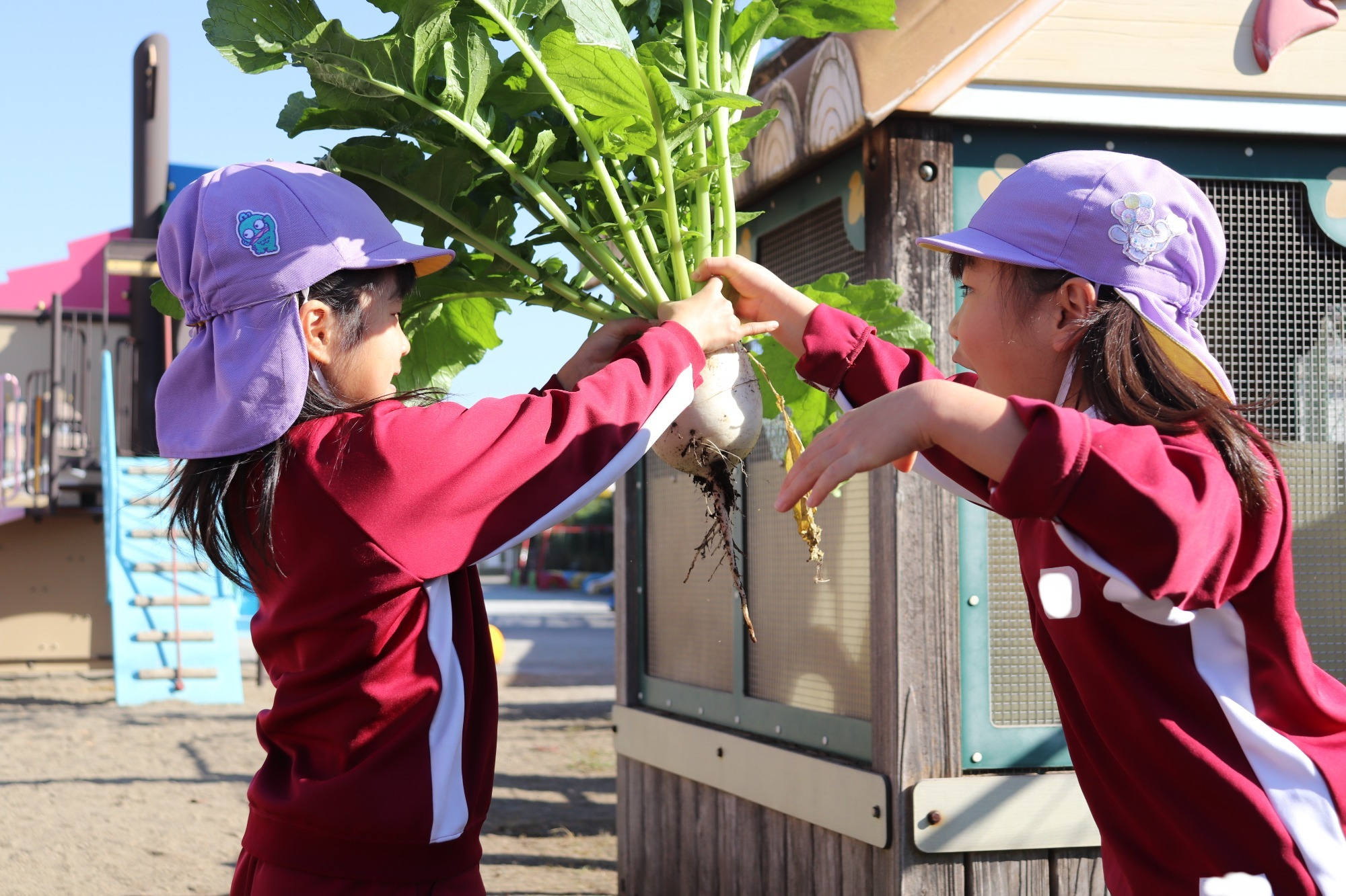 年長さんが9月に種まきしたカブがすくすくと大きく育ち、いよいよ収穫の時期を迎えました! 毎日お水をあげたり、雑草や虫を取り除いたりしながら大切に育ててきました! 今年は大きなカブが多く、「うんとこしょ!どっこいしょ!!」と大きなかけ声をかけながら力いっぱい引き抜きます!! 収穫したカブは子どもたちが給食調理室まで運び、調理員さんに調理をお願いしました(^_^)v 美味しい給食をお楽しみに~♪