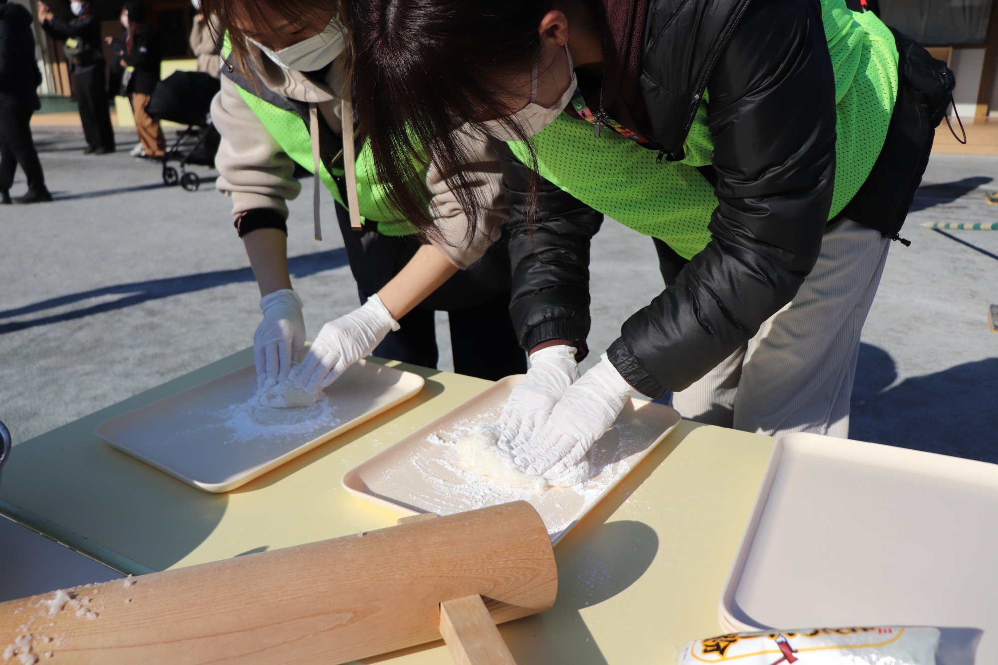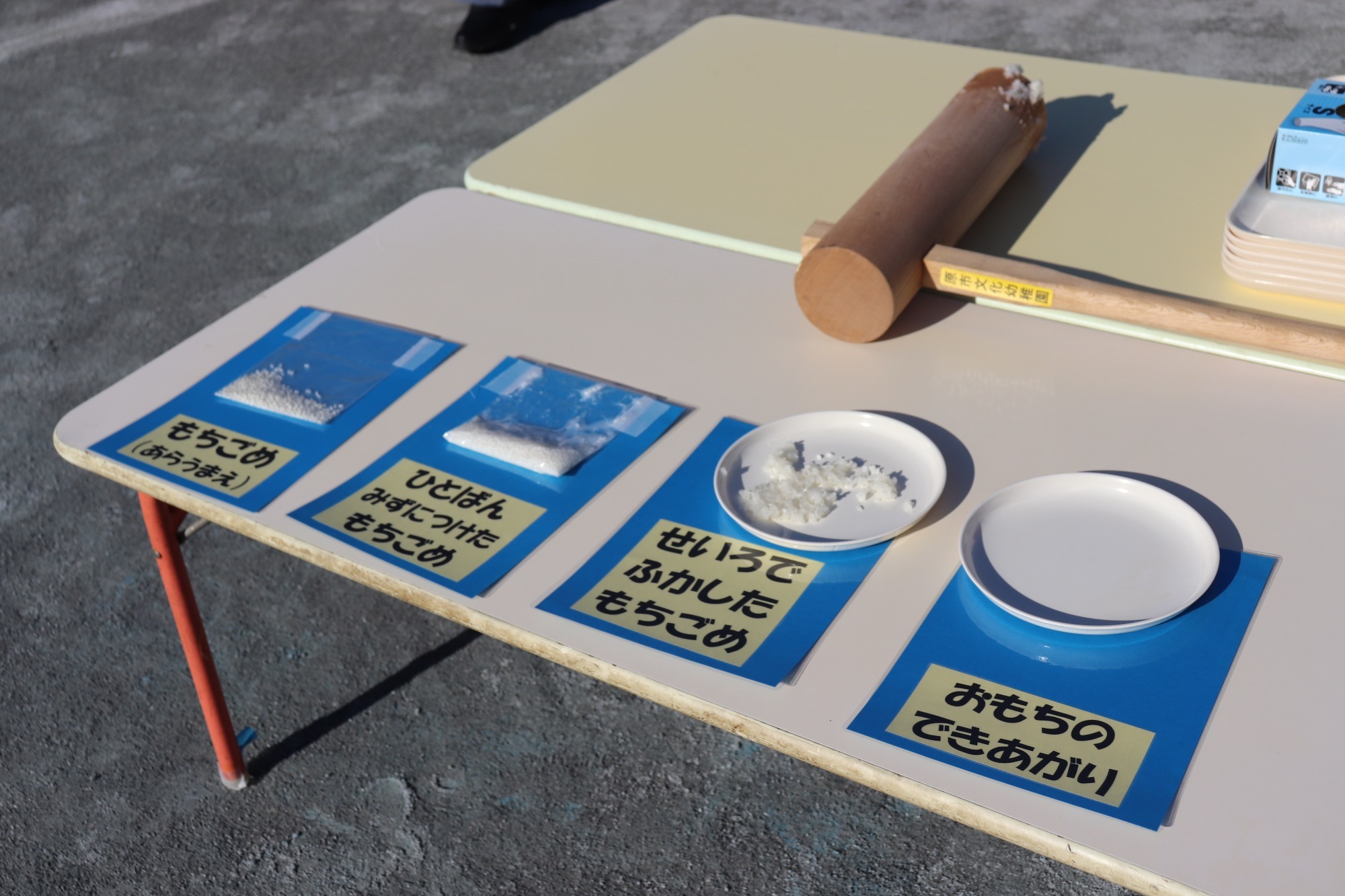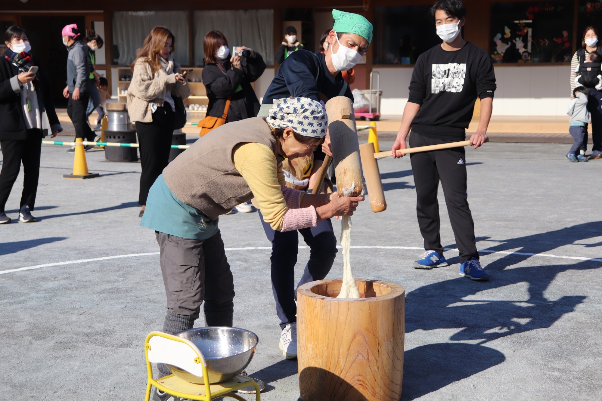 12月18日(水)晴天の空の下、園庭にもくもくと煙が上がりおもちつきが始まります! 大きな臼に真っ白であつあつの餅米が入り、杵でペッタン!ペッタン!とついていきます。子どもたちは豆絞りを巻き、大きな声でよいしょ~よいしょ~!!とかけ声をかけながらみんなでおもちつき体験!(^^)! 見学に来ていた保護者の方や先生たちも重~い杵を振り上げ、力一杯頑張ってついてくれました。つき上がったお餅はおもちつき係の保護者の方たちにお手伝いをしてもらい、昼食時、きな粉餅にしてた~くさんいただきました!! 子どもたちが何度もおかわりするほど、とっても美味しいおもちでした~(^_^)v