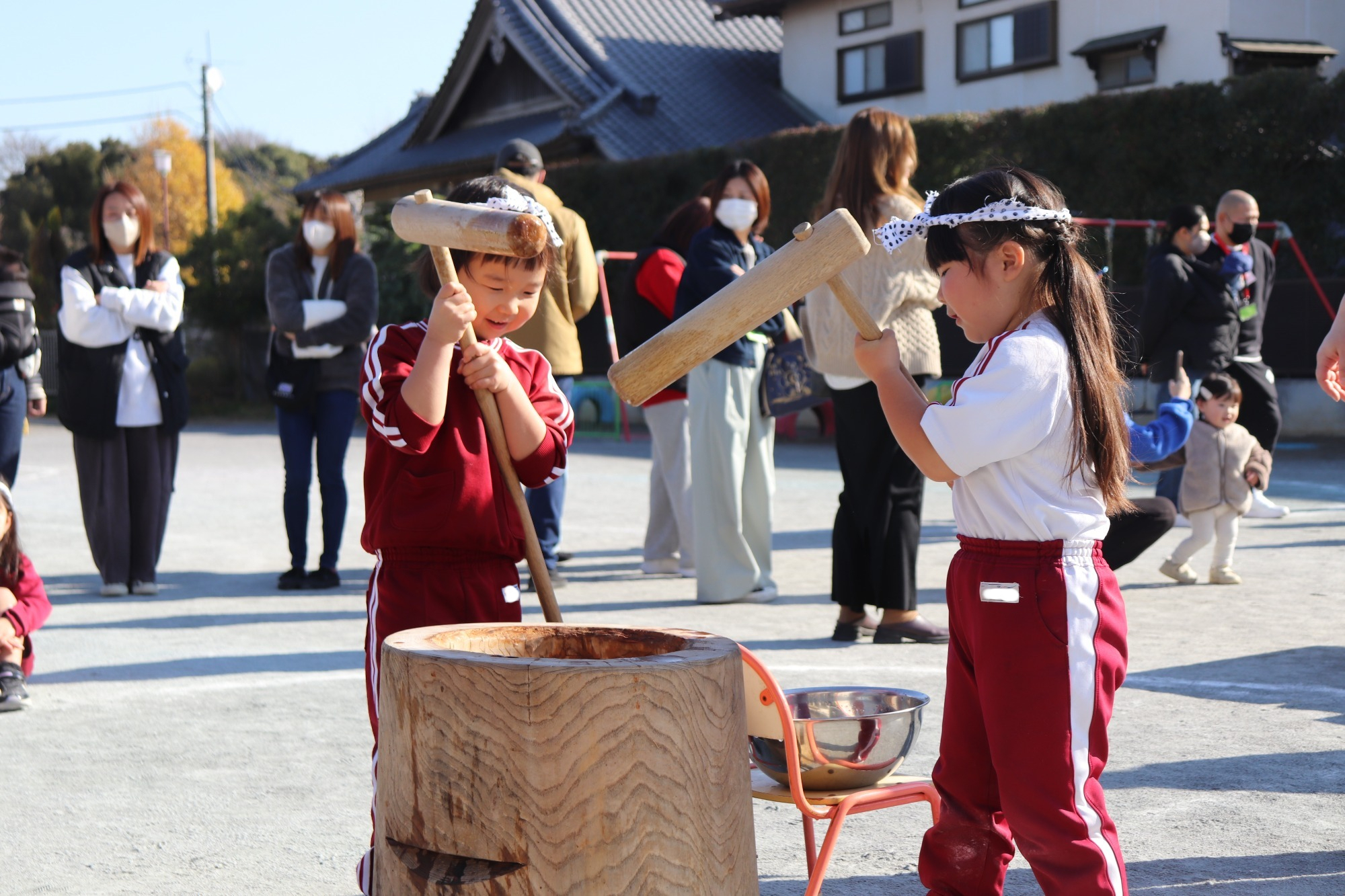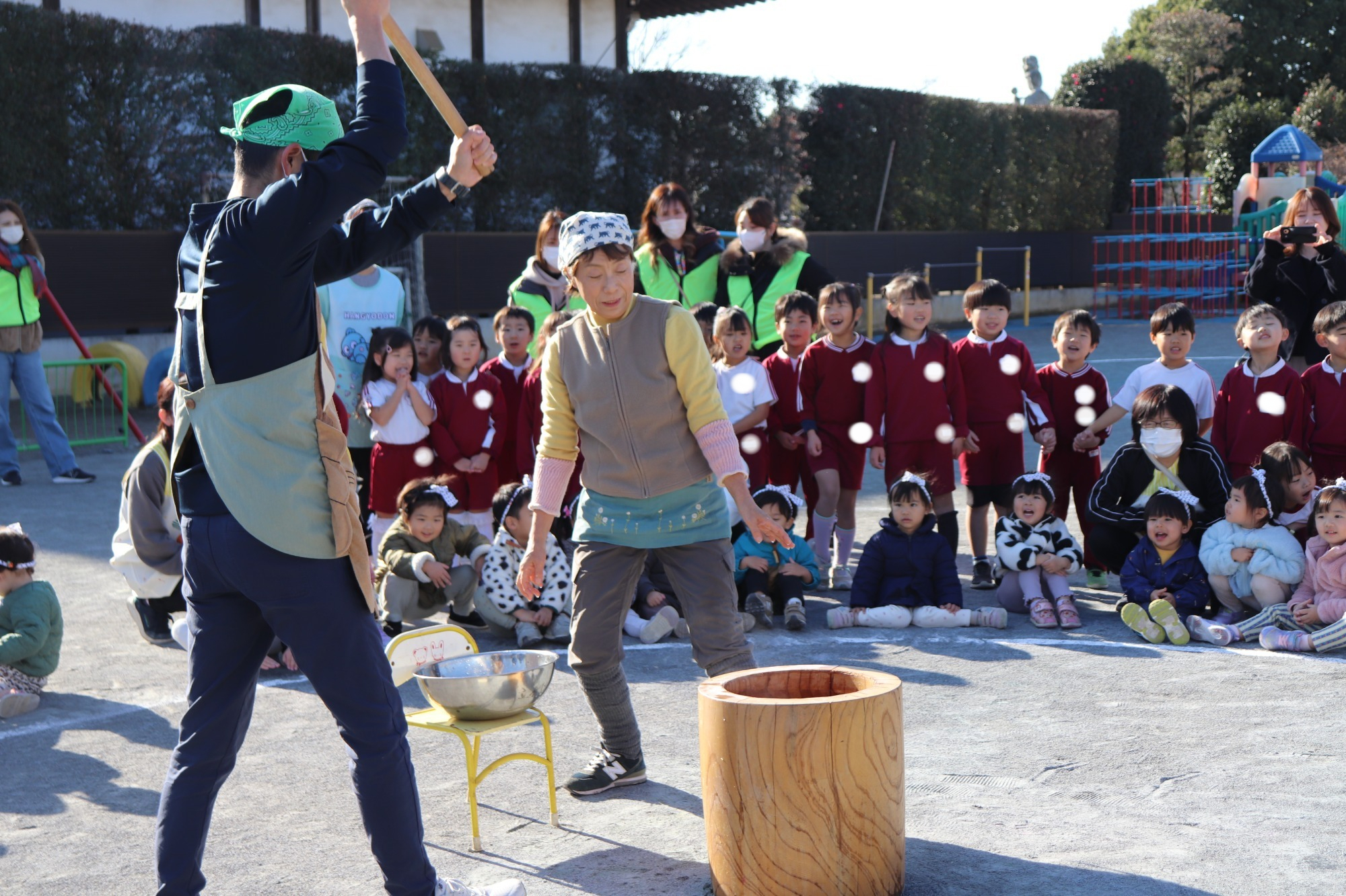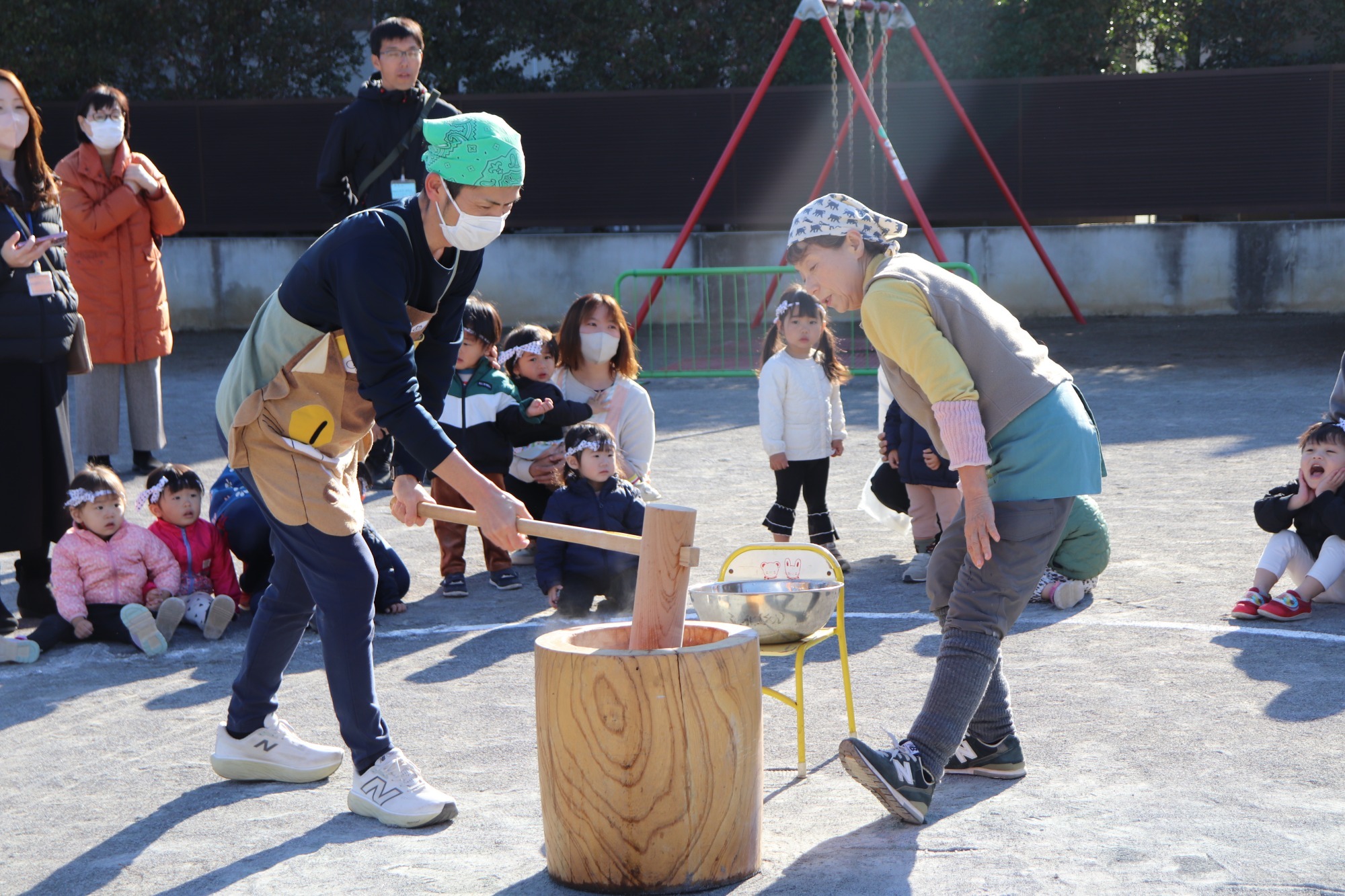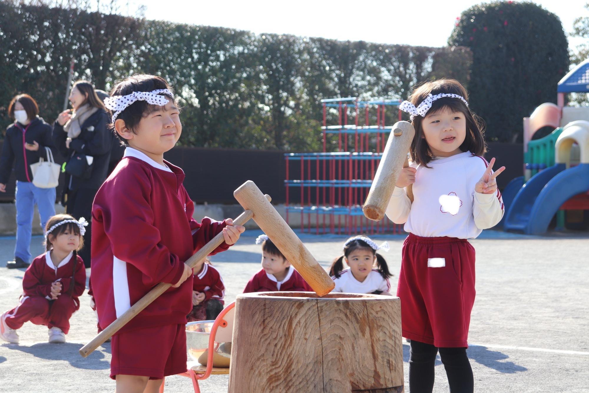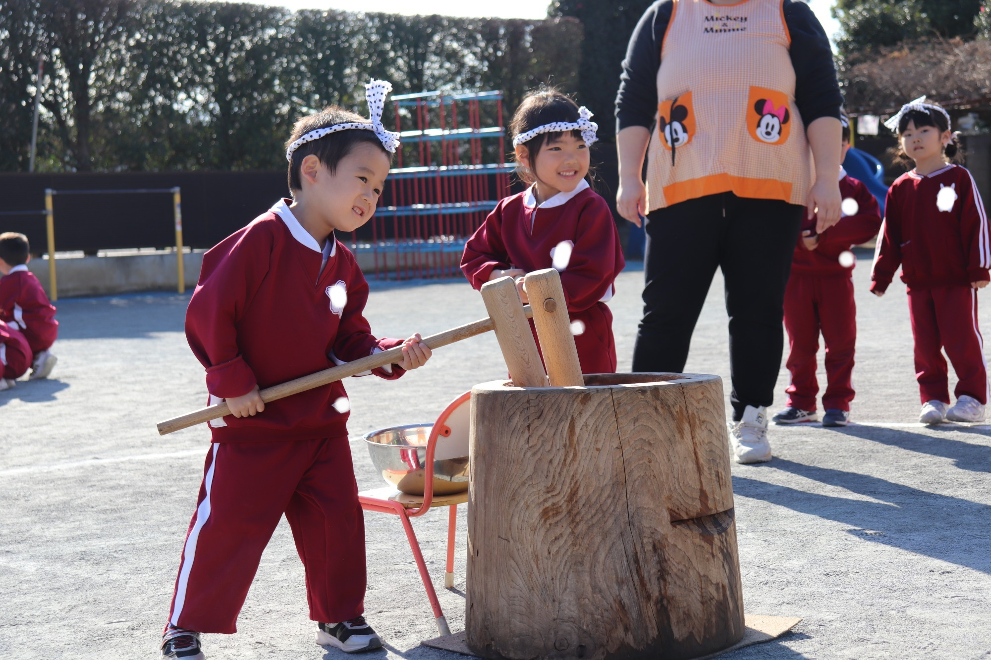 12月18日(水)園では青空の下おもちつきが行われました。子どもたちは豆絞りを巻き、重たい杵を振り上げて力一杯おもちをつきます! 周りを取り囲む保護者や子どもたちは「よいしょ~!よいしょ~!!」と大きな声で応援します。クラスではおもちつき係の方たちがつきたて熱々のおもちにきな粉をまぶし、子どもたちのために頑張ってくれました。できたてのきな粉餅はすご~~く伸びてと~ても美味しかったね!!(^_-)-☆