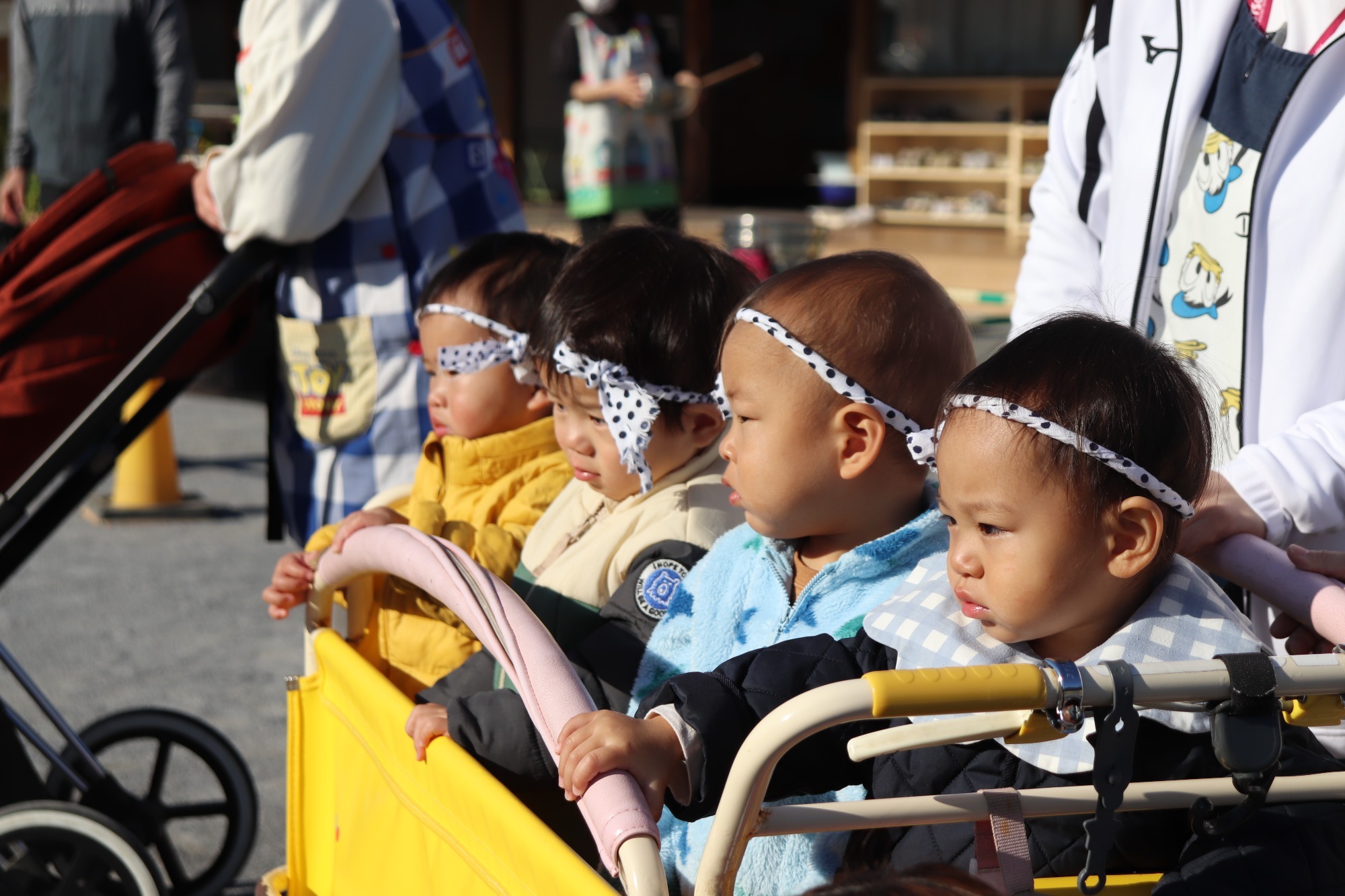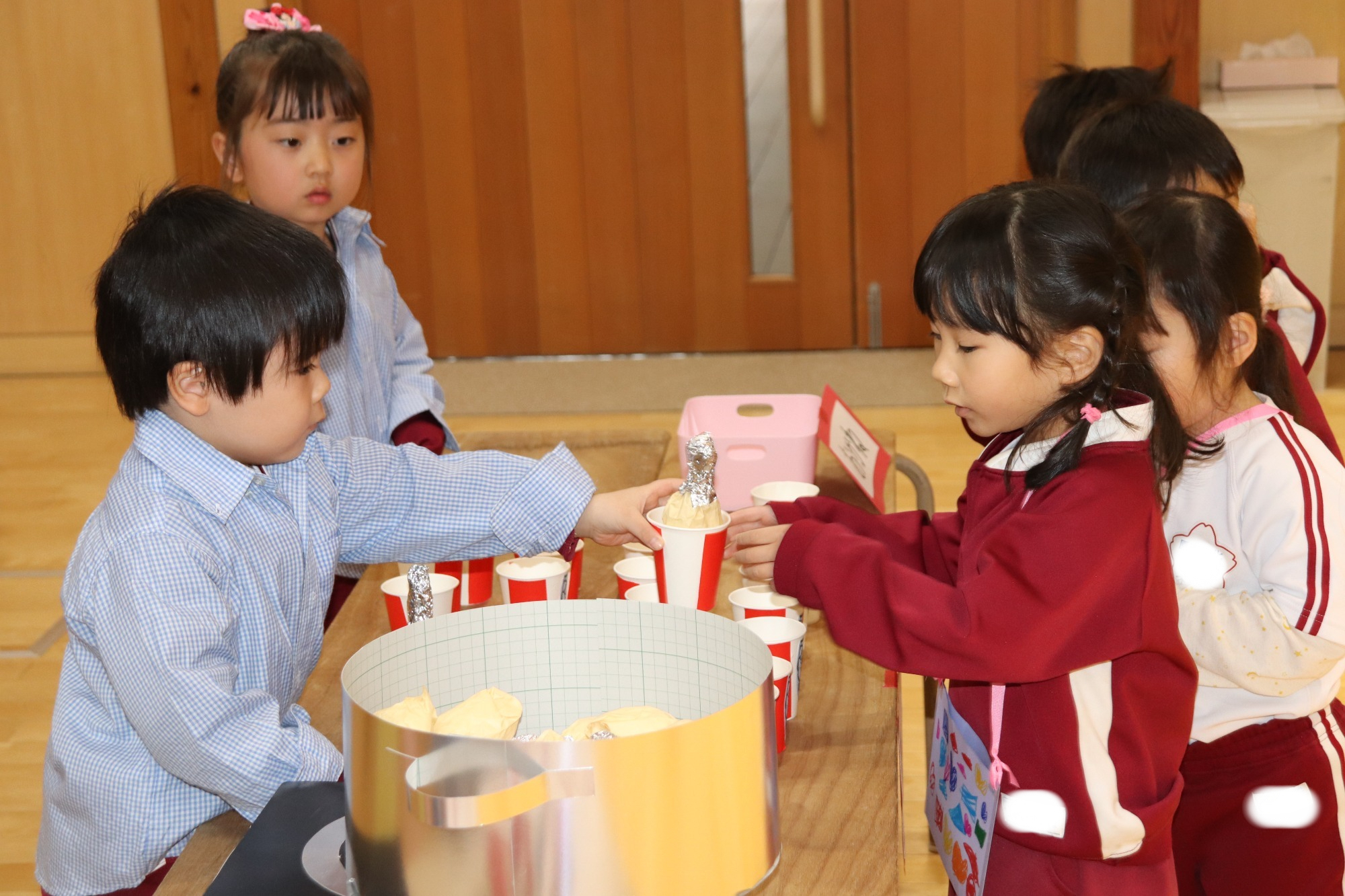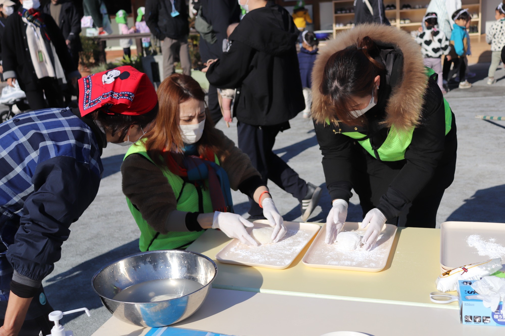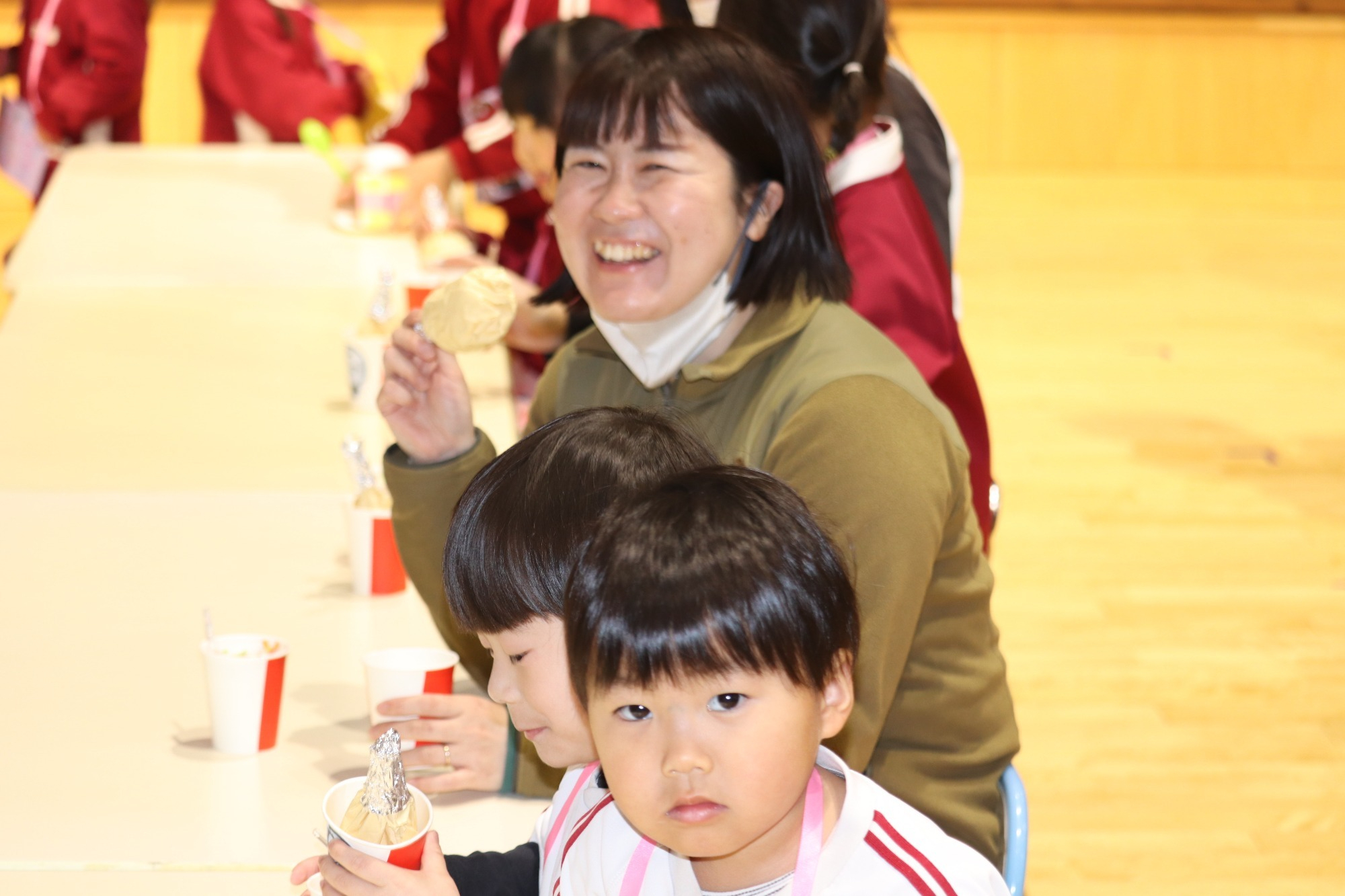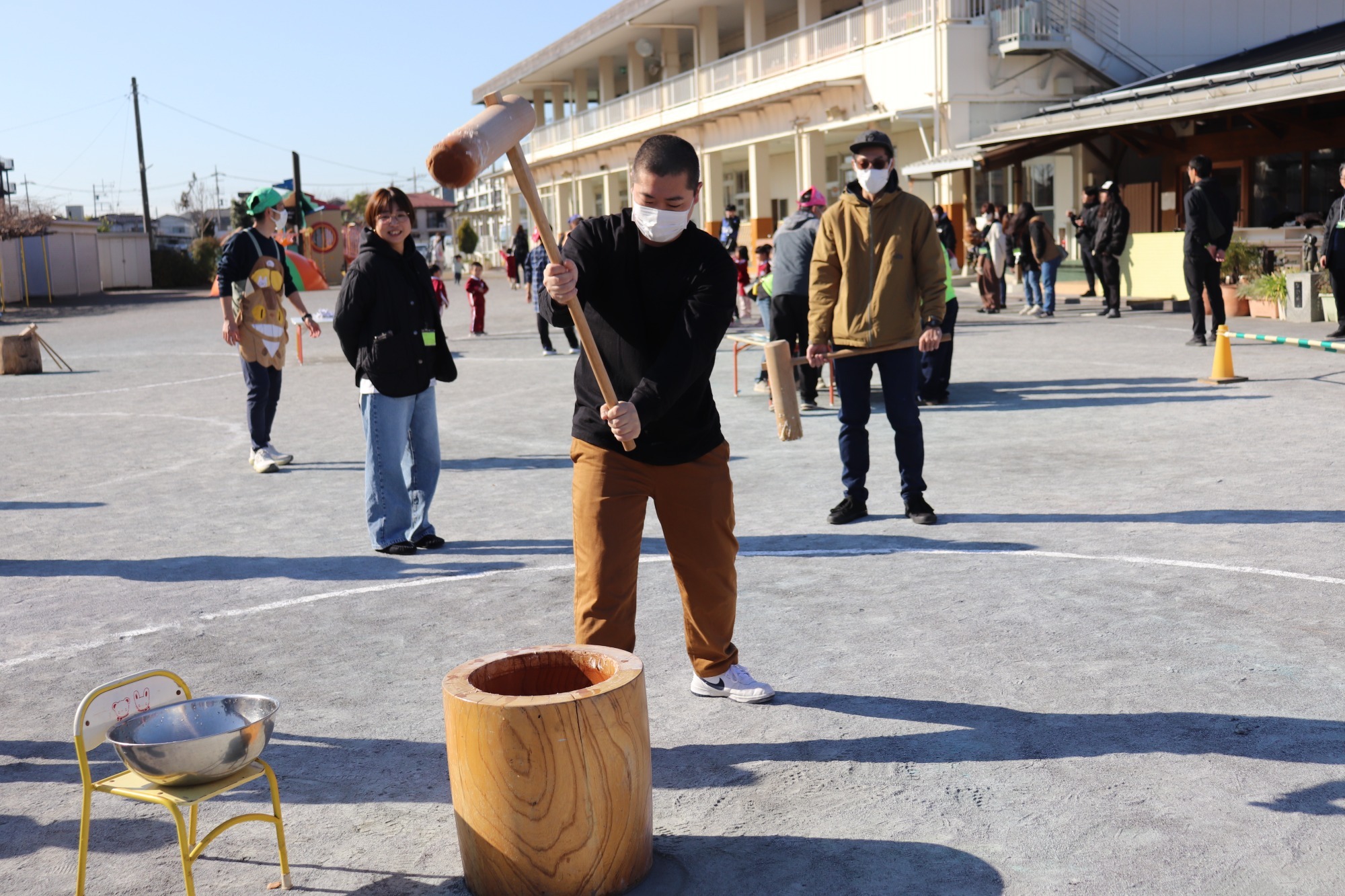 12月18日(水)園では青空の下おもちつきが行われました。子どもたちは豆絞りを巻き、重たい杵を振り上げて力一杯おもちをつきます! 周りを取り囲む保護者や子どもたちは「よいしょ~!よいしょ~!!」と大きな声で応援します。クラスではおもちつき係の方たちがつきたて熱々のおもちにきな粉をまぶし、子どもたちのために頑張ってくれました。できたてのきな粉餅はすご~~く伸びてと~ても美味しかったね!!(^_-)-☆
