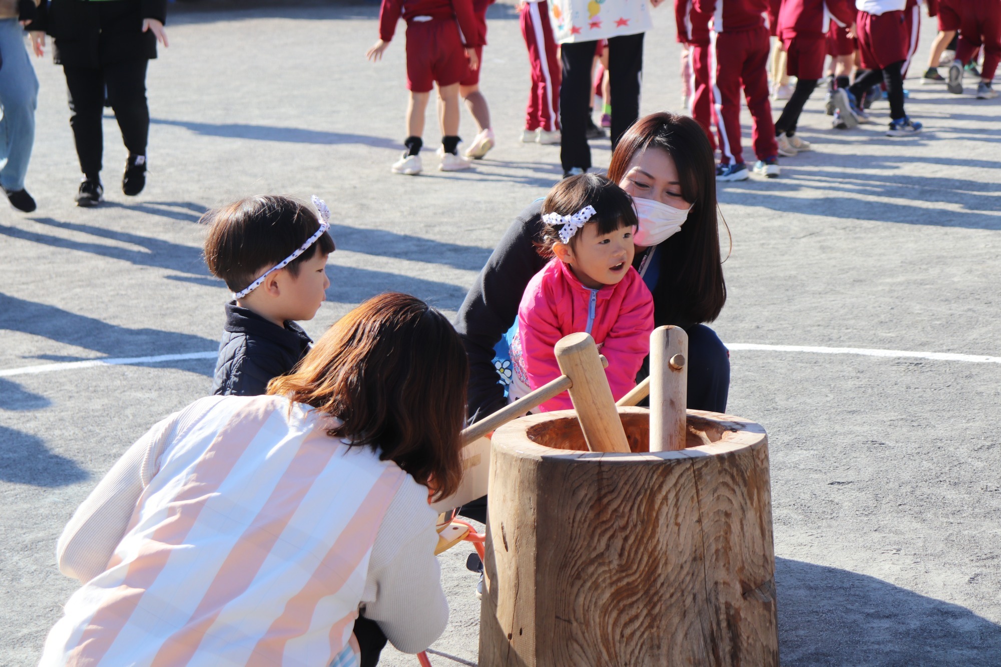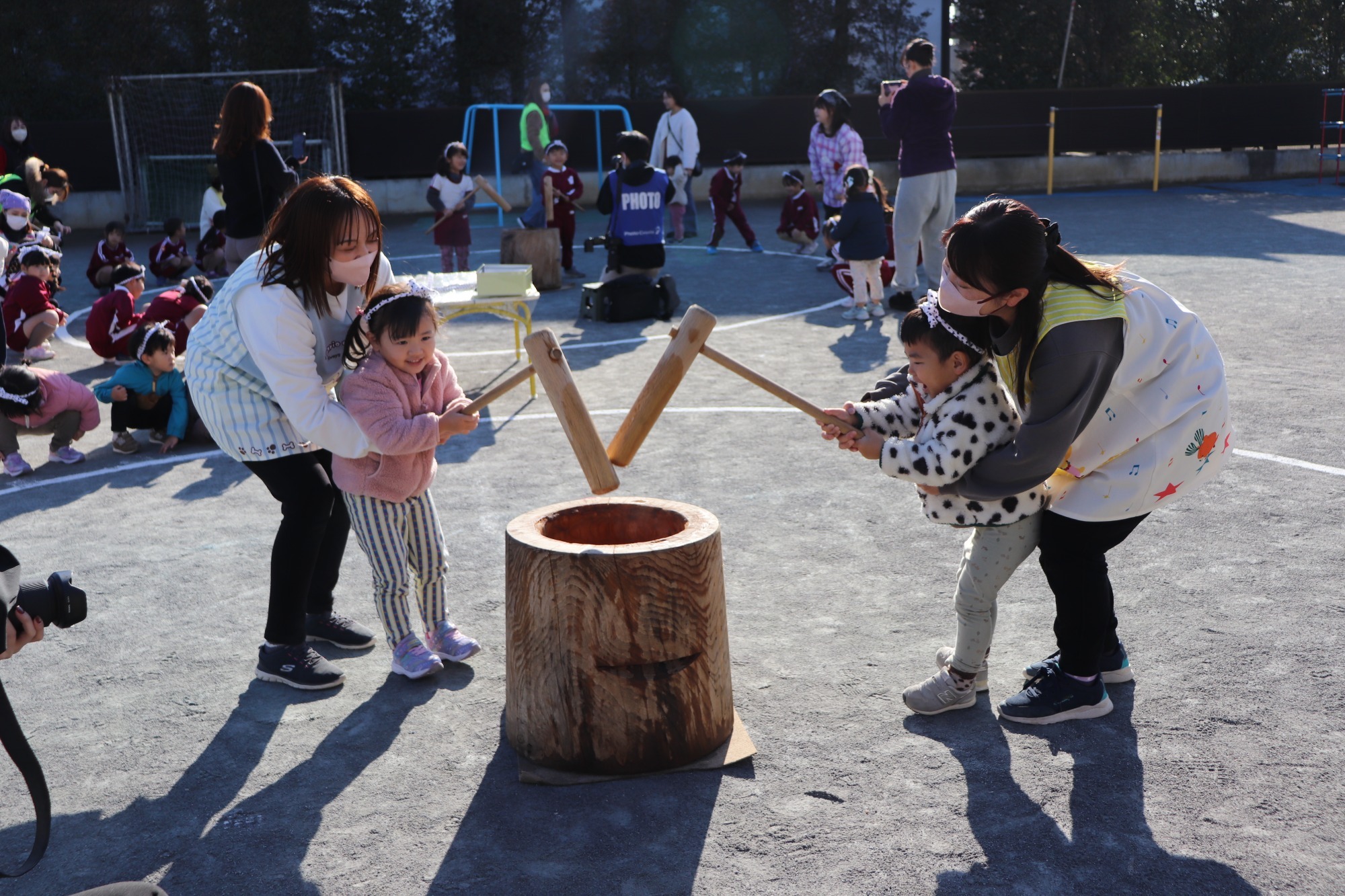 12月17日(水)晴天の空の下、園庭にもくもくと煙が上がりおもちつきが始まります! 大きな臼に真っ白であつあつの餅米が入り、杵でペッタン!ペッタン!とついていきます。子どもたちは豆絞りを巻き、大きな声でよいしょ~よいしょ~!!とかけ声をかけながらみんなでおもちつき体験!(^^)! 先生たちも重~い杵を振り上げ頑張ってついてくれました。つき上がったお餅はおもちつき係の保護者の方たちにお手伝いをしてもらい、その場で鏡餅を作りました!!またひとつ経験を積み、楽しい思い出ができたね!(^_^)v