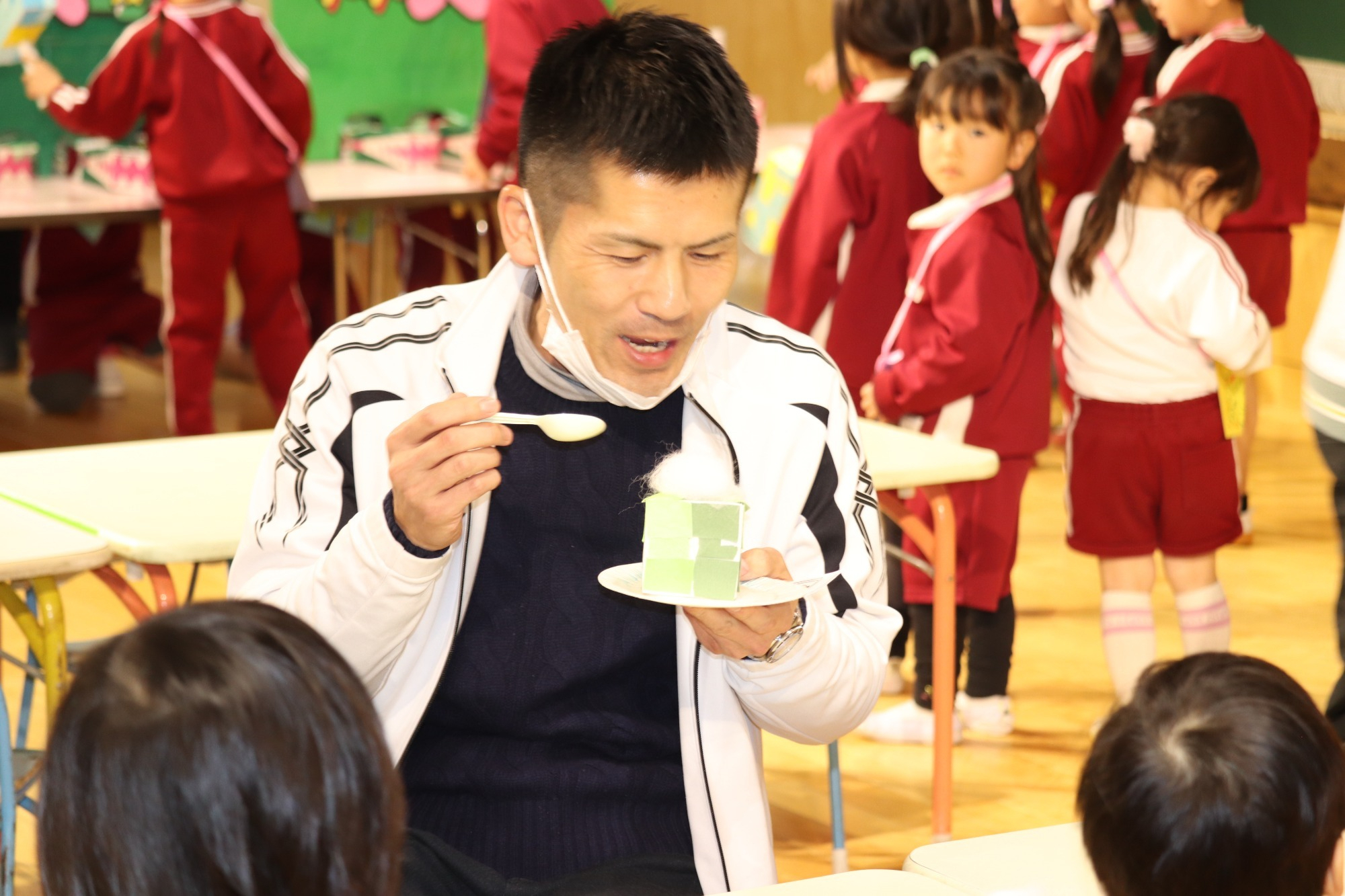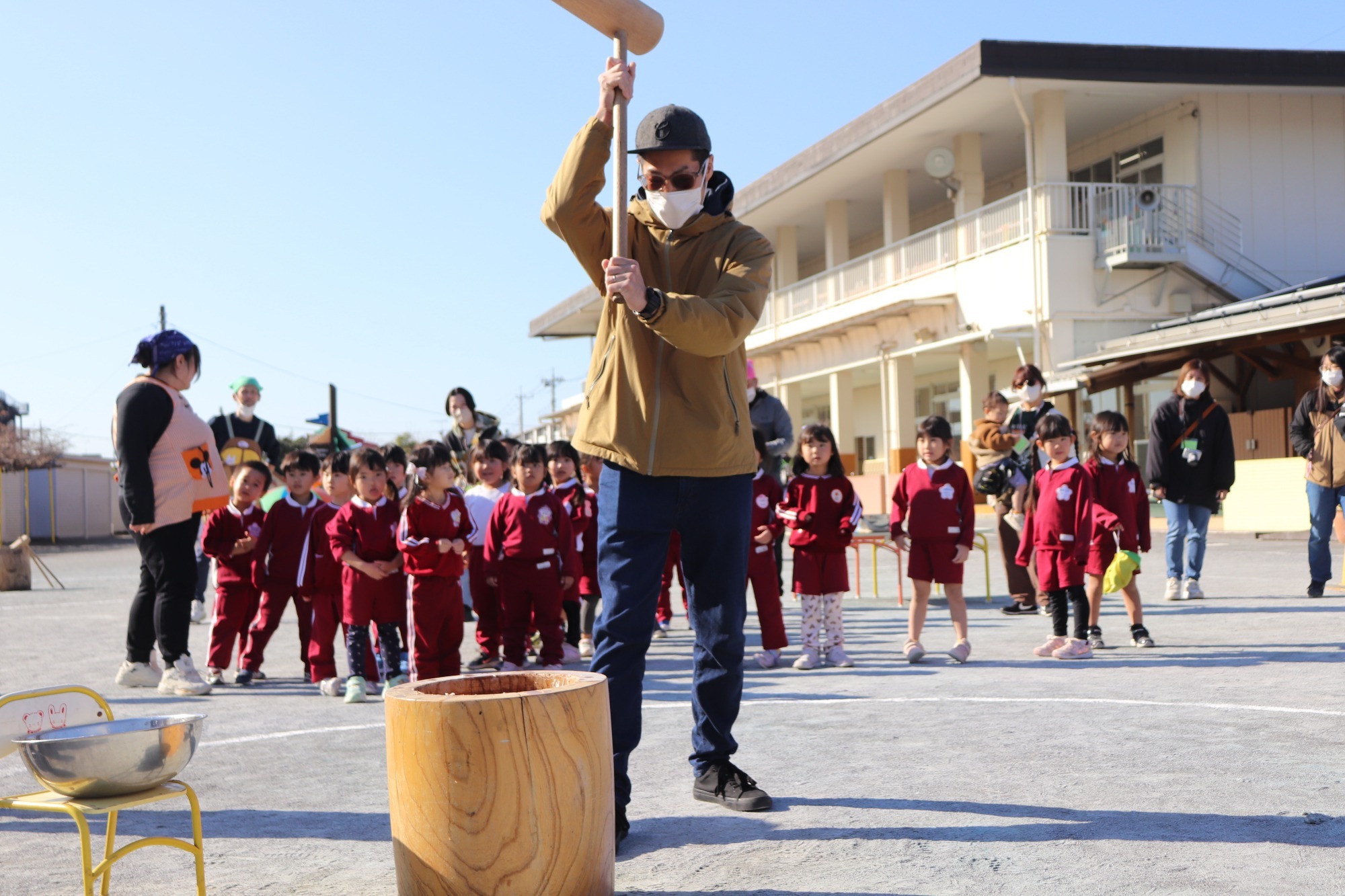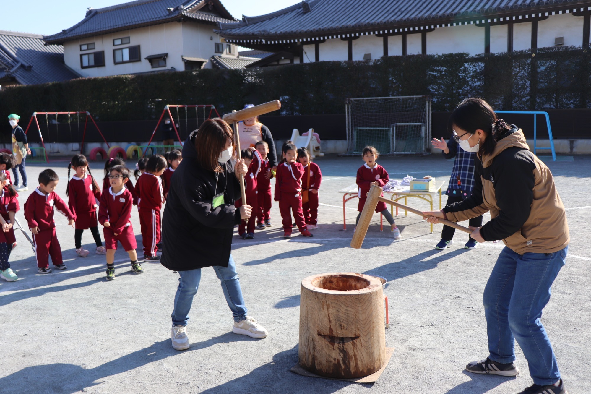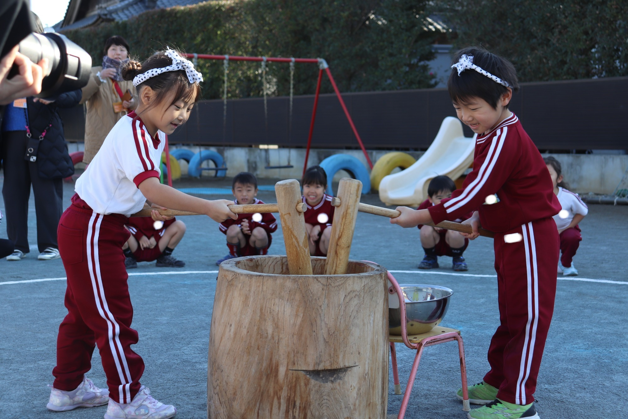 16日(水)園庭にておもちつきを行いました。園児たちは豆絞りを頭にしばり重たい杵を必死に持ち上げ「よいしょ~! よいしょ~!」のかけ声の中、楽しくおもちつき体験をしました。なかなか見ることのできないおもち作りの光景に大興奮の園児たち!先生たちも可愛い声援に応え一生懸命頑張りました(*^^)v 搗きたてのおもちは、給食時にきな粉もちにしてお腹いっぱい食べることができました。とっても美味しかったね(^^♪