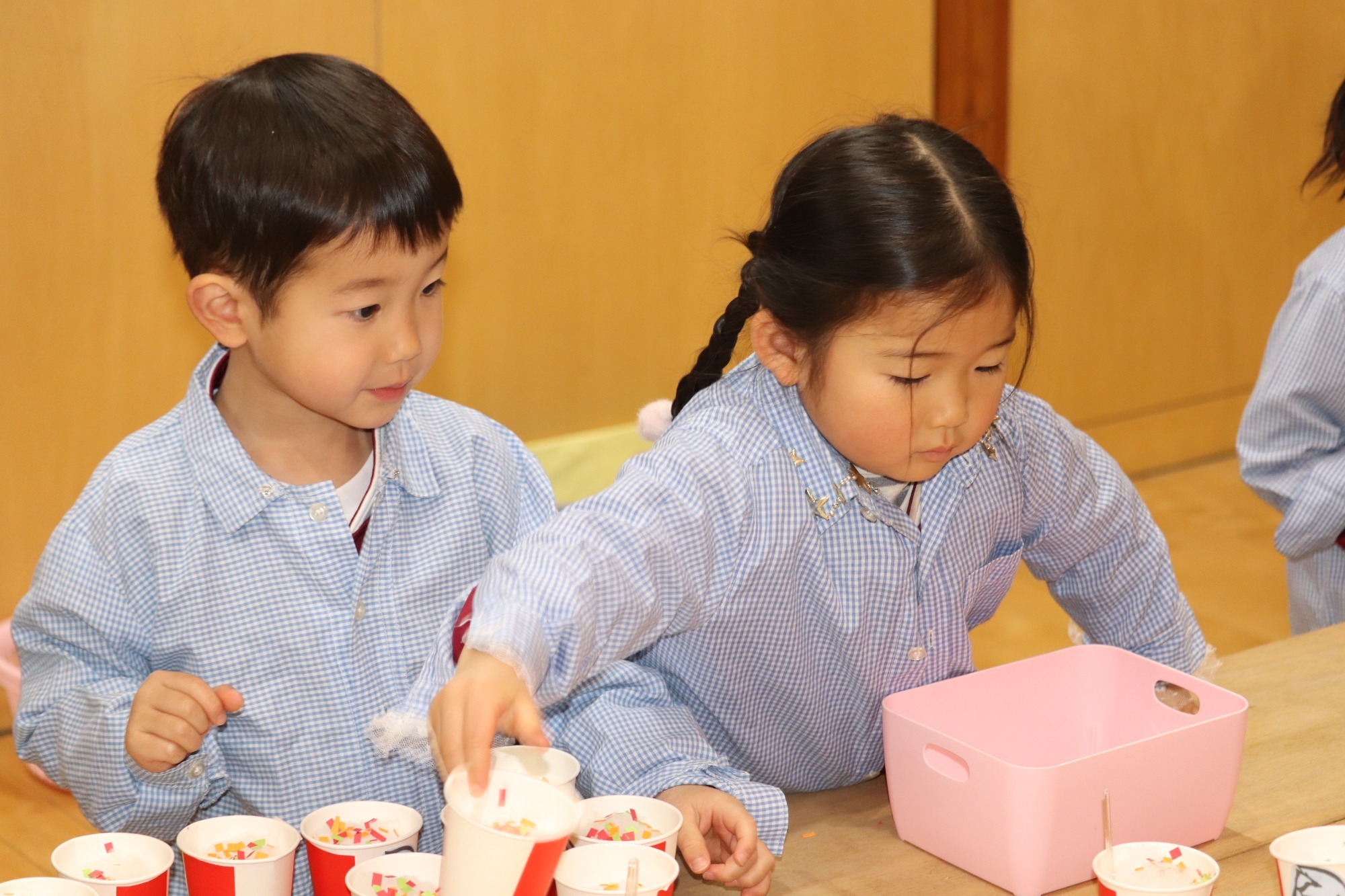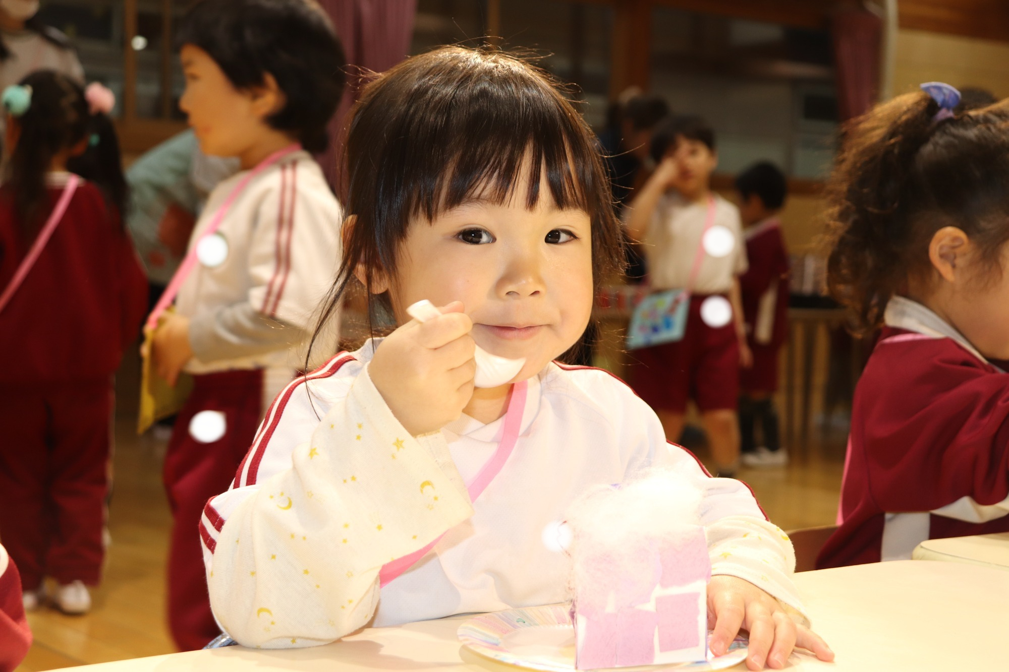 2月26日(水)ホールにて年中・少さんのお店やさんごっこが行われました。クラスごとに好きなお店の色々な商品を作り、売ったり買ったりを楽しむごっこ遊びです。つばめ組はうどんやさん、すずめ組はどーなつやさん、ひばり組はわたあめやさん、ひよこ組はプリンやさん、それぞれ工夫を凝らした美味しそうな商品がたくさん並び開店すると「いらっしゃいませ~!」「これください!!」元気いっぱいの声がホールに響き渡ります(^^)/ 行列に並んで商品を選んだり、お金を払ったり、初めての経験に少し戸惑いながらもみんなで協力し合い、交代しながら楽しい時間を過ごしました\(^o^)/