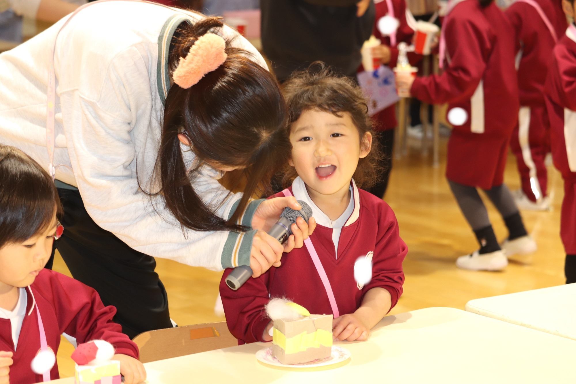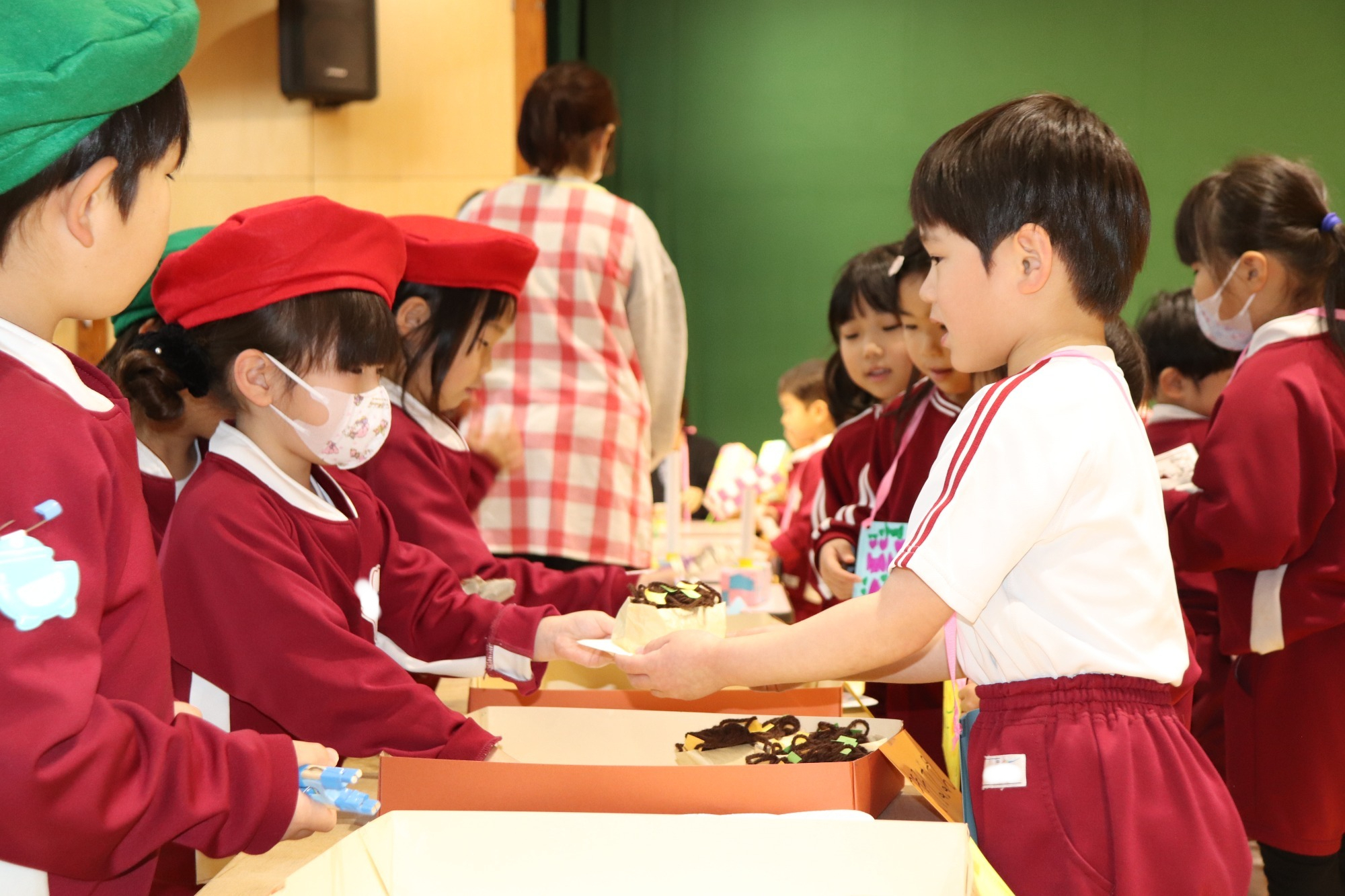 2月25日(水)ホールにて年中・少さんのお店やさんごっこが行われました。クラスごとに好きなお店の色々な商品を作り、売ったり買ったりを楽しむごっこ遊びです。つばめ組はパンやさん、すずめ組はゲームやさん、ひばり組はケーキやさん、ひよこ組はケンタッキーやさん、それぞれ工夫を凝らした楽しくて美味しそうな商品がたくさん並び開店すると「いらっしゃいませ~!」「これください!!」元気いっぱいの声がホールに響き渡ります(^^)/ 行列に並んで商品を選んだり、お金を払ったり、初めての経験に少し戸惑いながらもみんなで協力し合い、交代しながら楽しい時間を過ごしました\(^o^)/