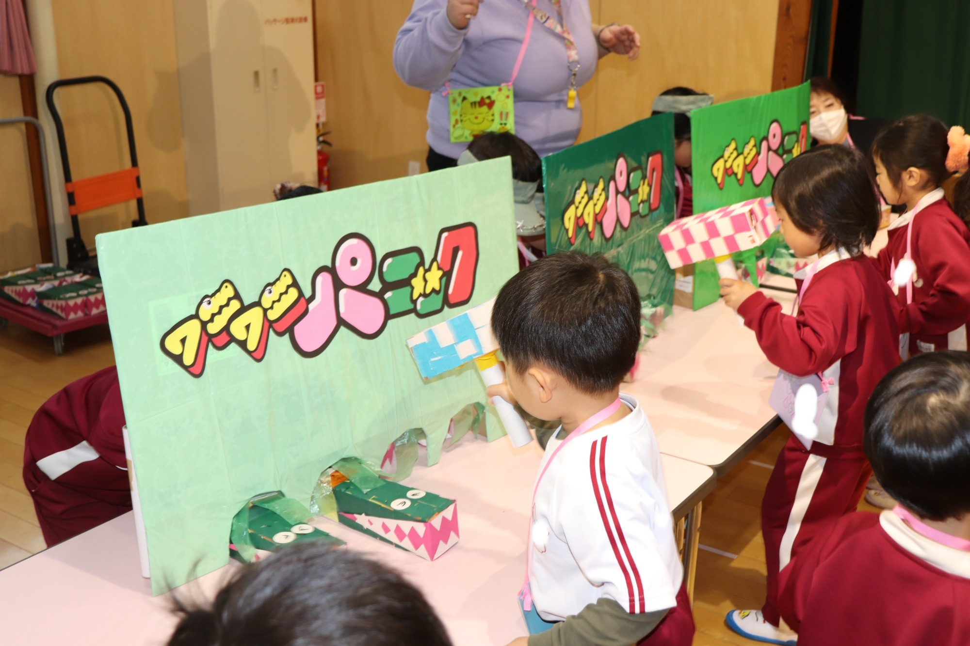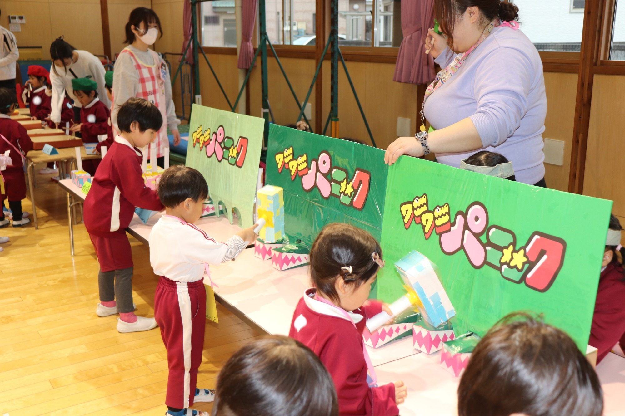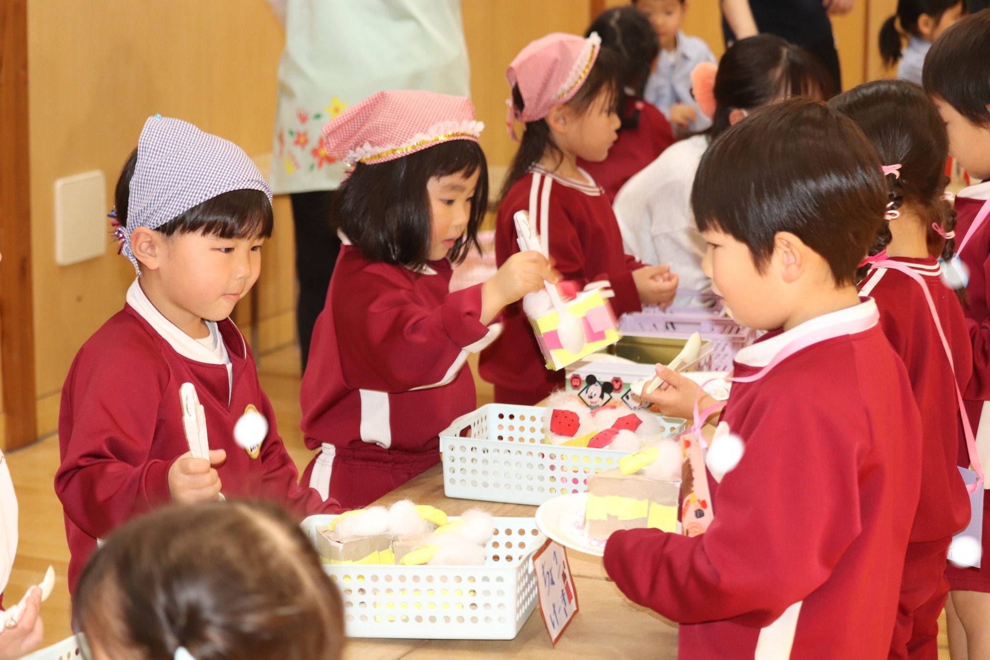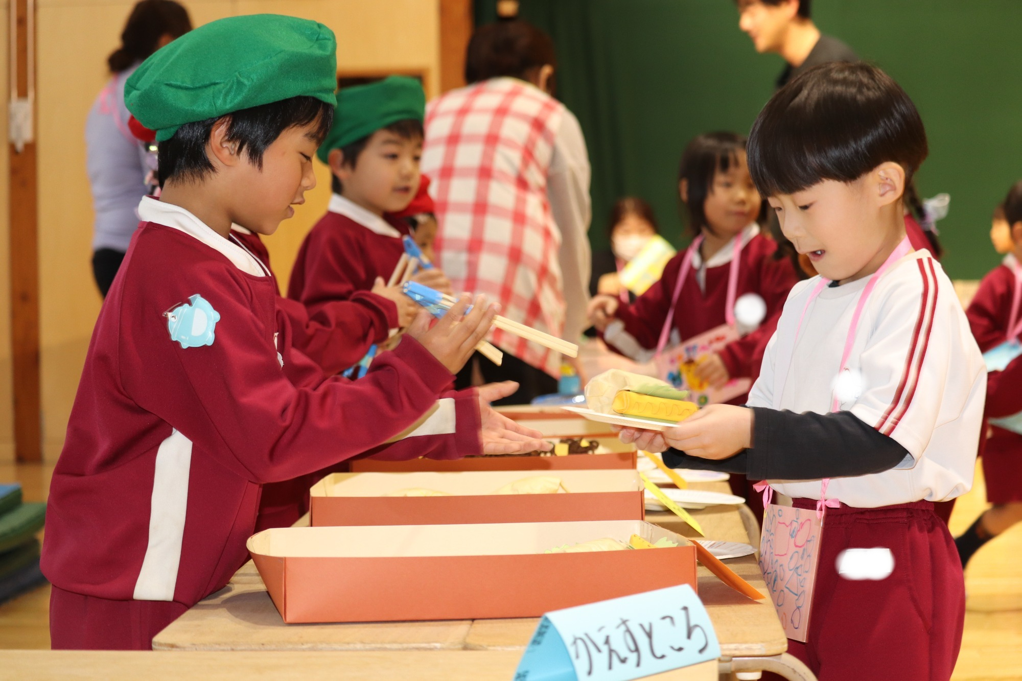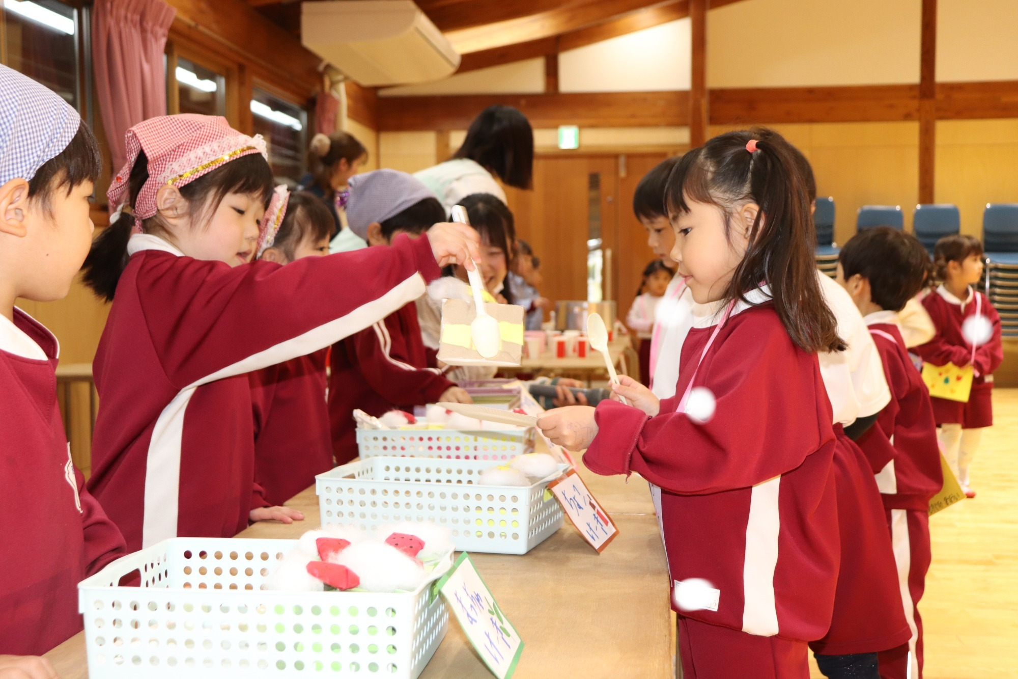 2月26日(水)年中・少組の子どもたちがホールでお店やさんごっこを行いました。手作りのおもちゃ、美味しそうな食べ物の数々を「いらっしゃいませ~」と大きな声を出しながらお店で売る子、「これをください!」とお金を出して買う子に別れ、交代しながらごっこあそびを楽しみました!! 保育園の小さなお客さんたちも参加してみんな初めての経験にニコニコ笑顔(^o^) 物を売ったり買ったりする体験はとても良い学びになったことと思います。