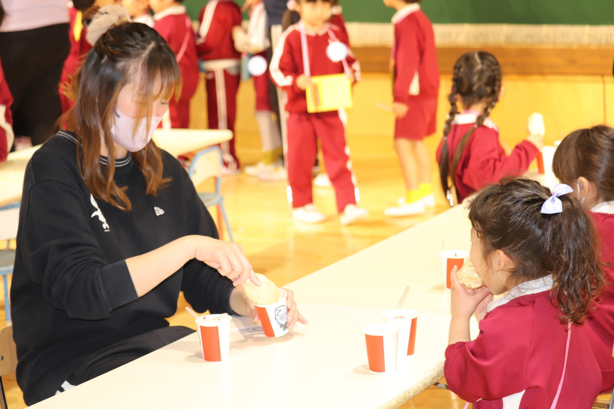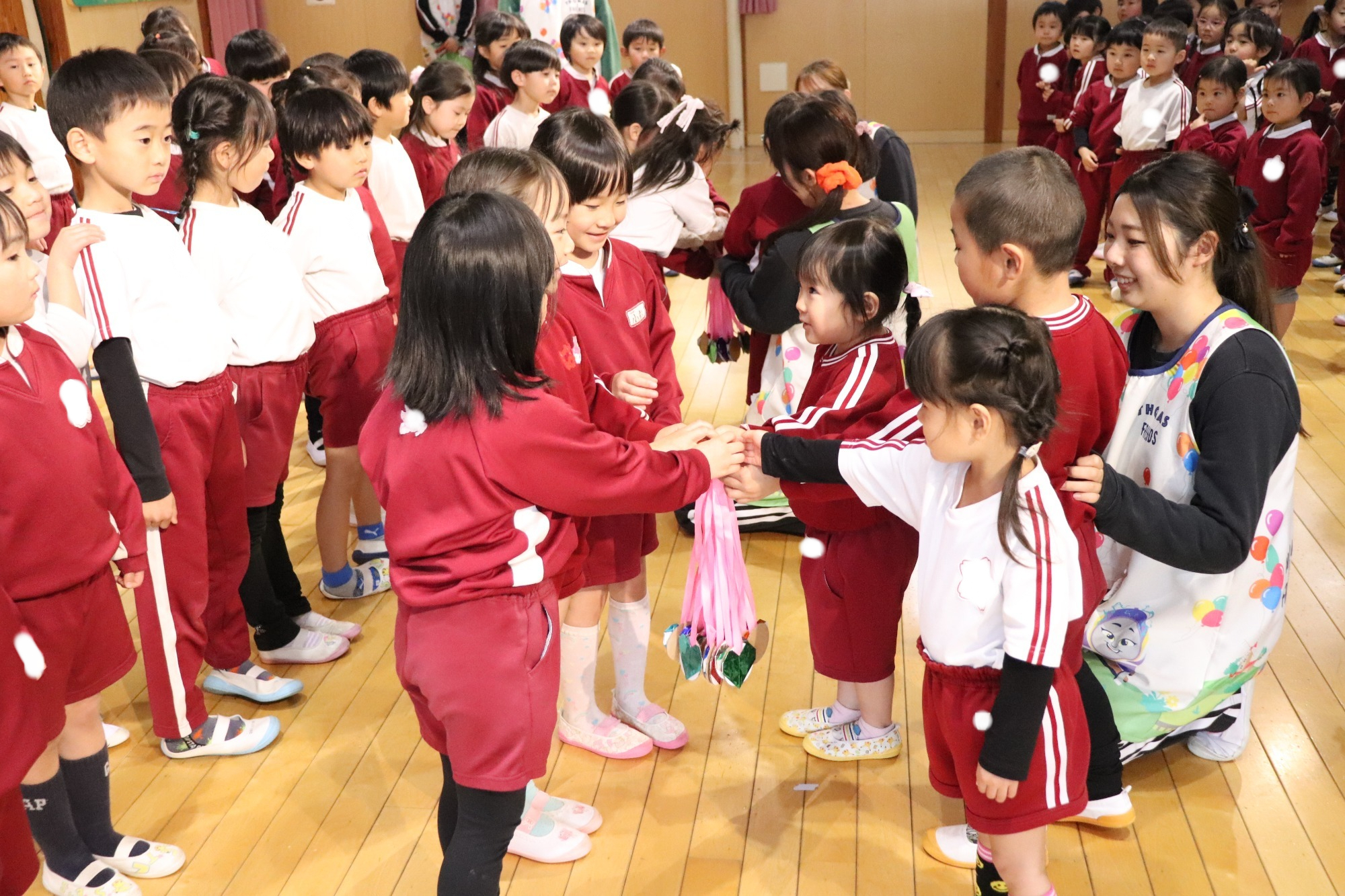 3月1日(月)もうすぐ卒園を迎える年長さん・・・(T_T) 年長さんと一緒に良い思い出を作りたいという先生たちの発案で、年長・中・少、そして先生たちが共に楽しい1日を過ごしました。穏やかな晴天の中、園庭に全園児が集まり一緒にお弁当を食べたり、年長・中・少が混合の3チームに分かれ男女別でリレーも行い子どもたちは大喜び!! 初企画の数々に大興奮でとても嬉しそうな笑顔が溢れていました(^^♪ 最後にお互いお別れのエールを交わし、年長さんへメダルのプレゼントを渡しました。キラキラのメダルを胸に小学校へ行っても頑張ってね!!(^_-)-☆