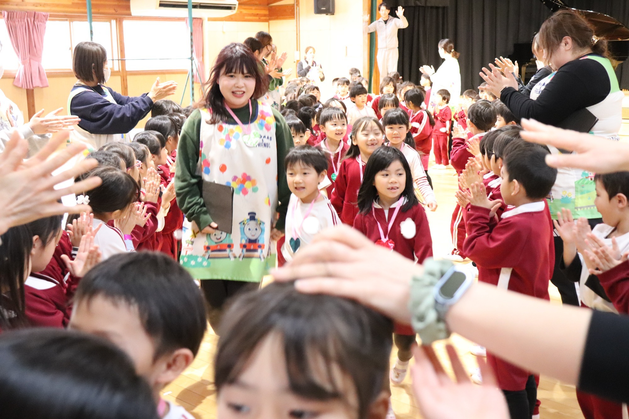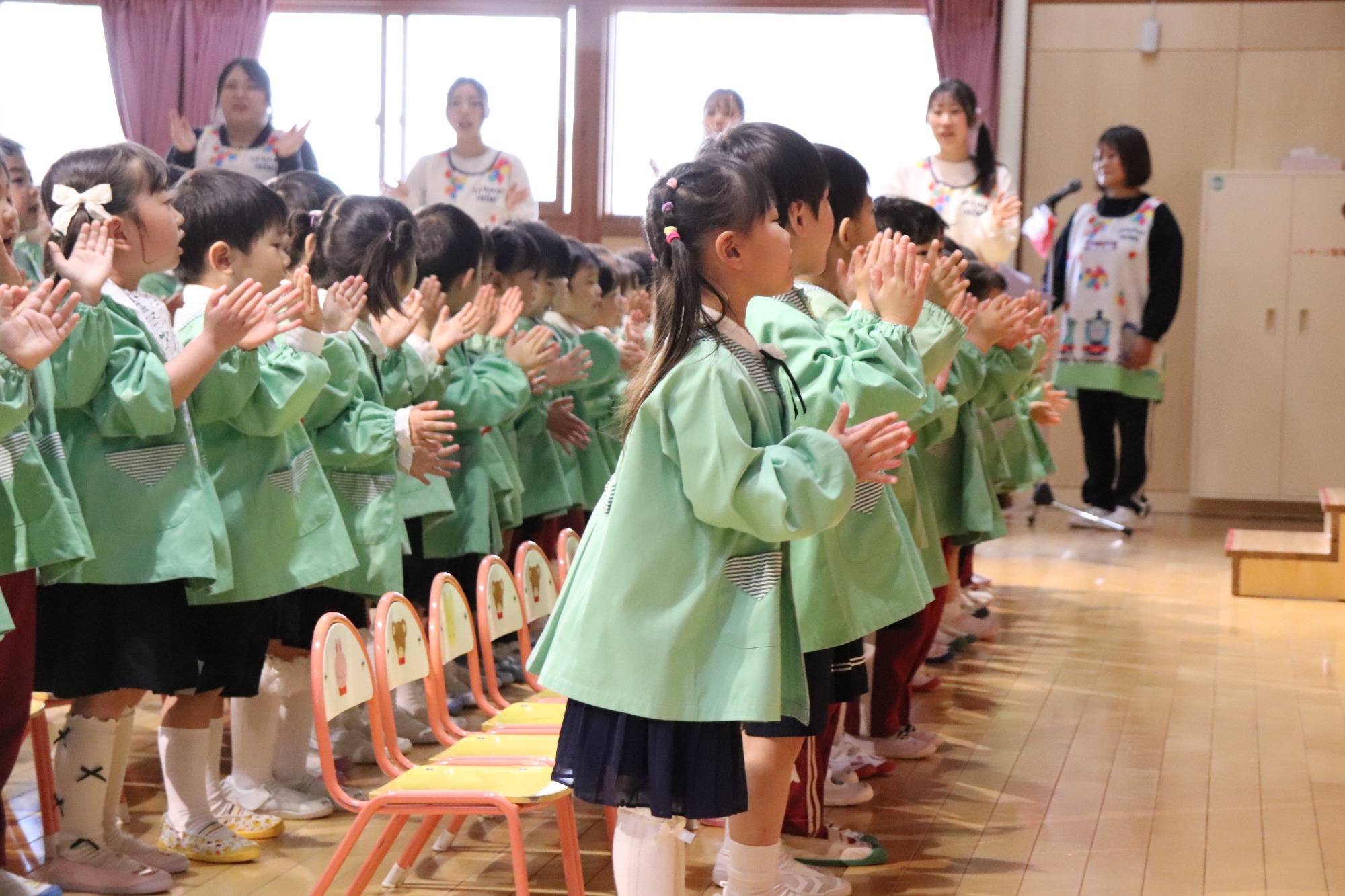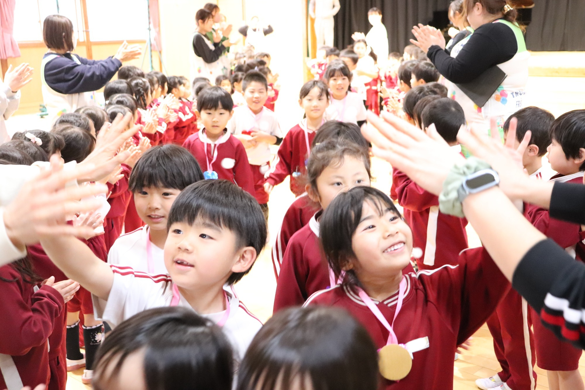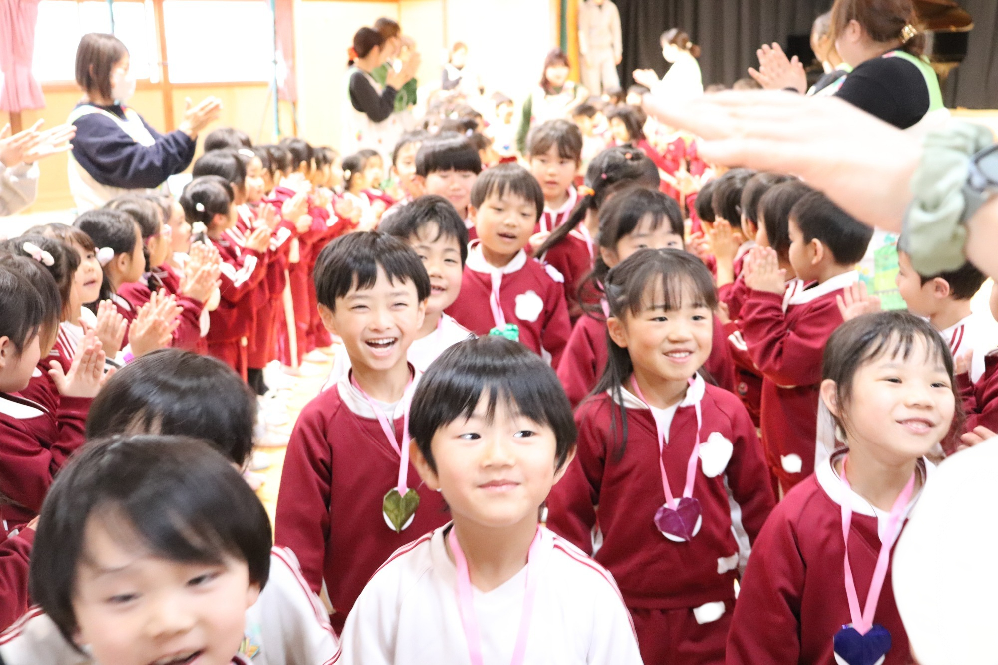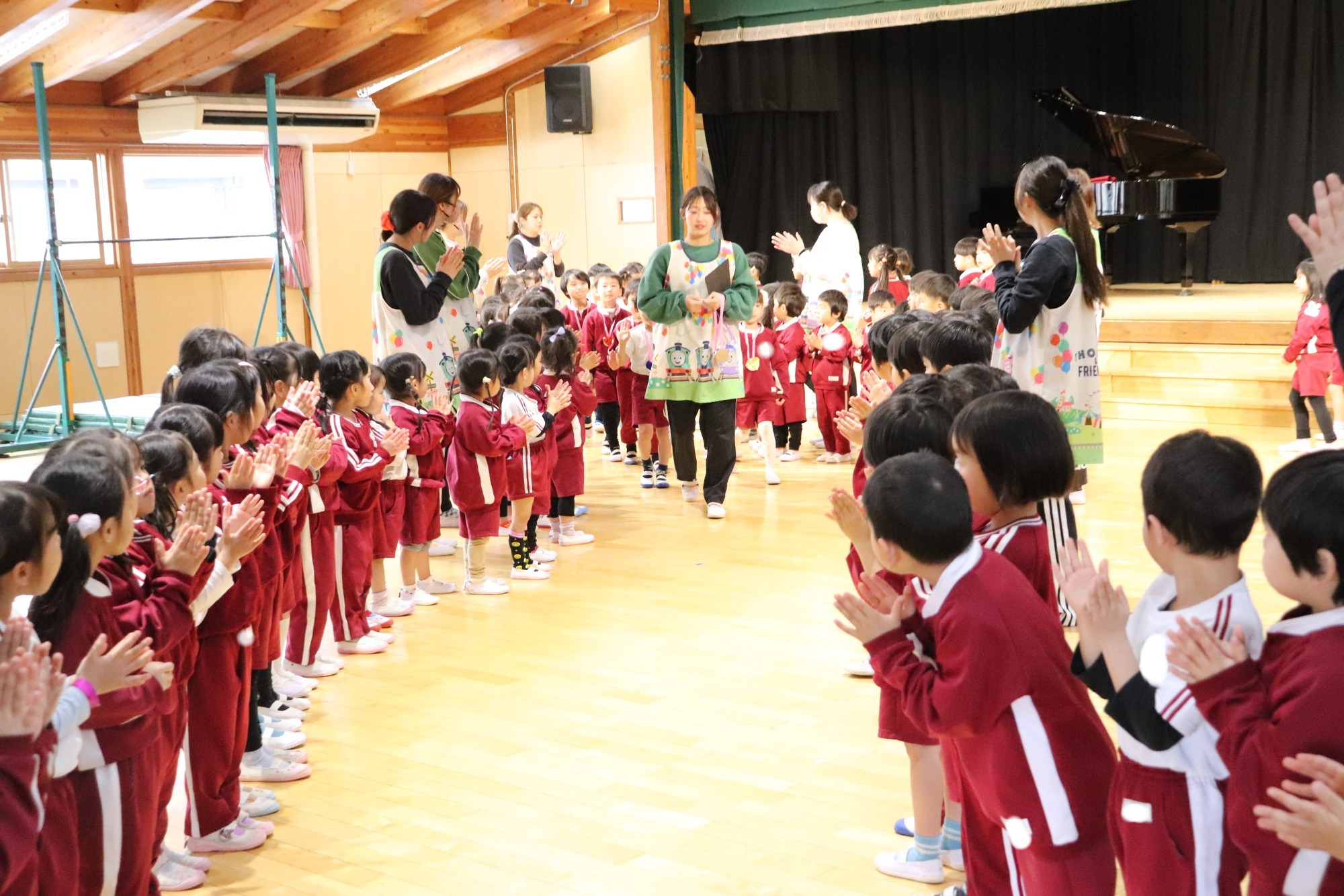 3月2日(月)もうすぐ卒園を迎える年長さん(T_T) 年長さんと一緒に過ごすことも残りわずかとなり、思い出作りのためにお別れ会を行いました。先生たちによる、とても綺麗な『フィンガーアクション』をみんなで楽しんだり、お互い歌のプレゼントやお別れのエールを交わし、最後に年中・少さんから年長さんへメダルのプレゼントを贈りました。キラキラのメダルを胸に小学校へ行っても頑張ってね!!(^_-)-☆