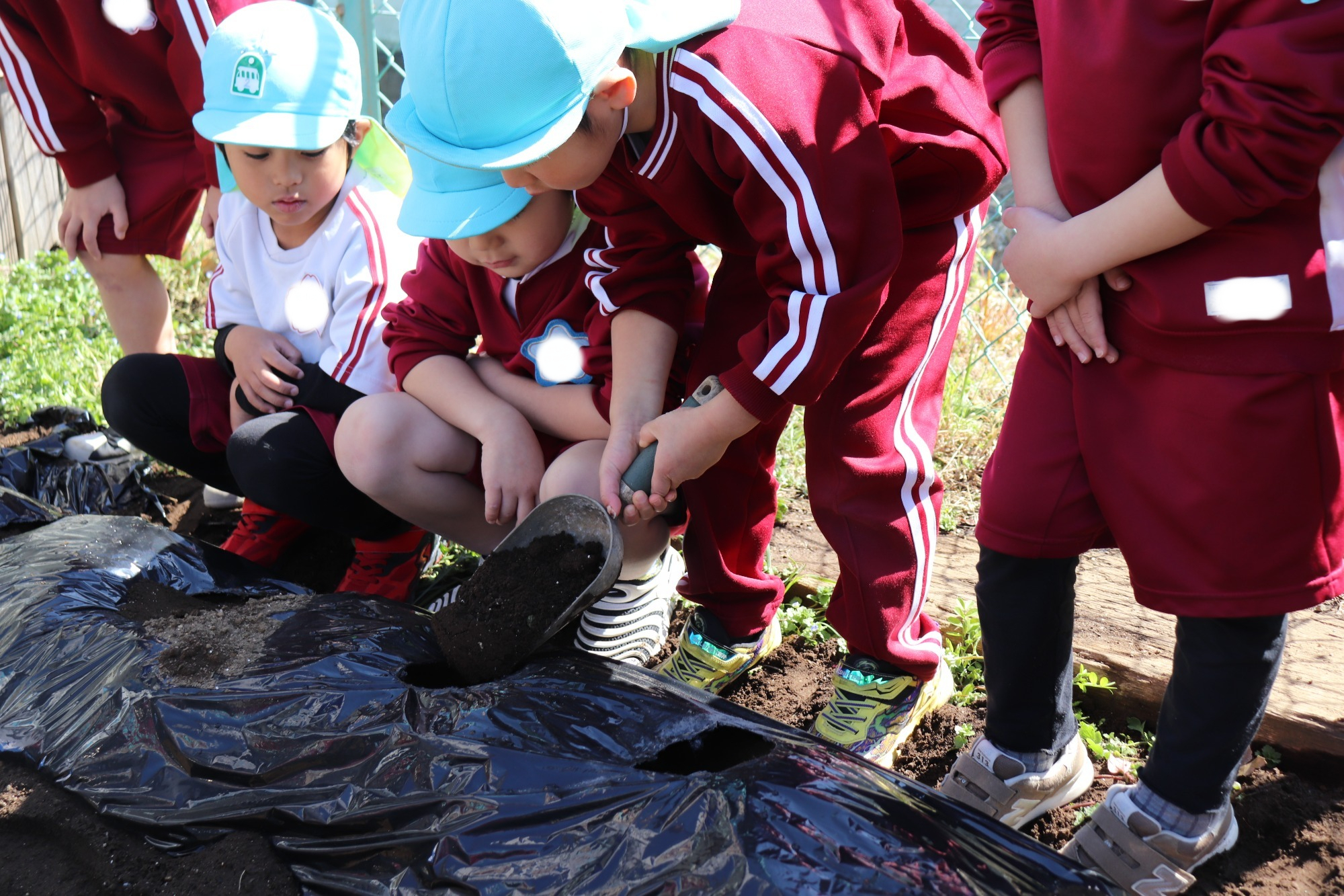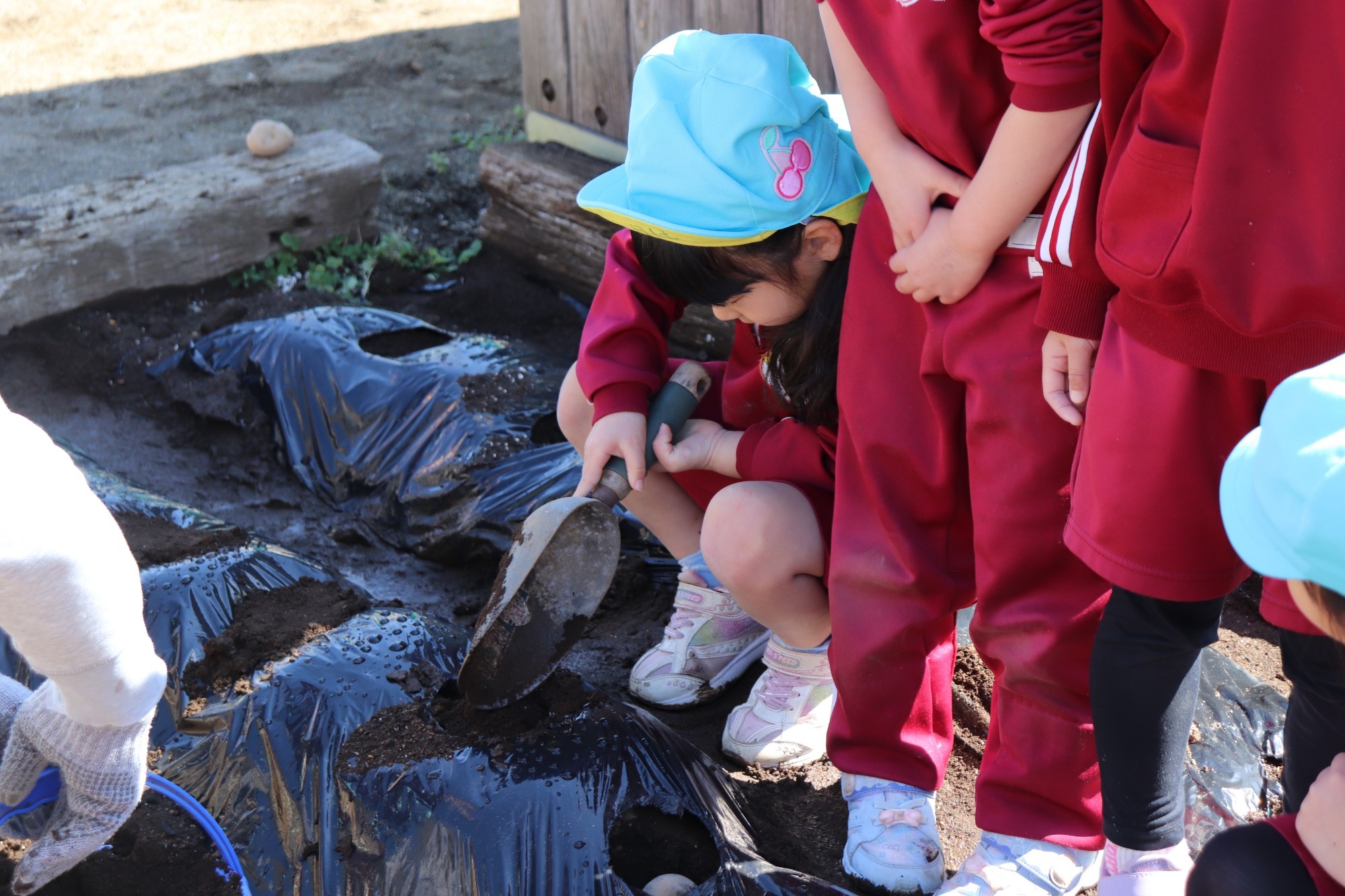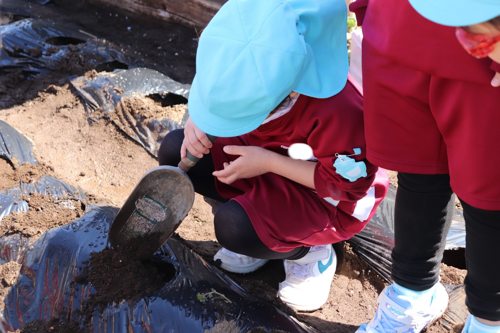 年長さんが秋の収穫に向け、畑にカブの種をまきました。温かい土を掘りながら小さくてきれいな種を丁寧にまき、土をかぶせて種まきの終了です!これから少しずつ水をあげたり、雑草を抜いたりと大きく育つまでたくさんのお世話を頑張ろう!(^_^)v