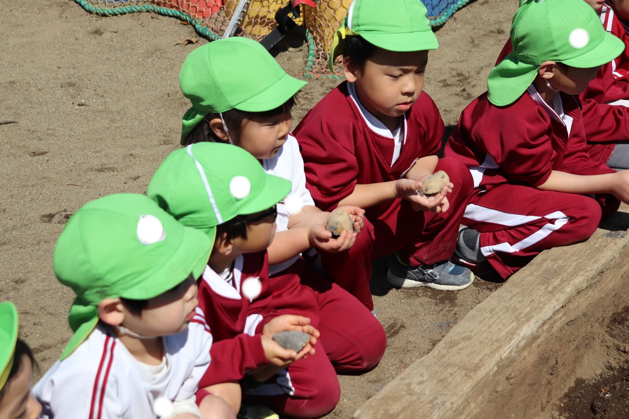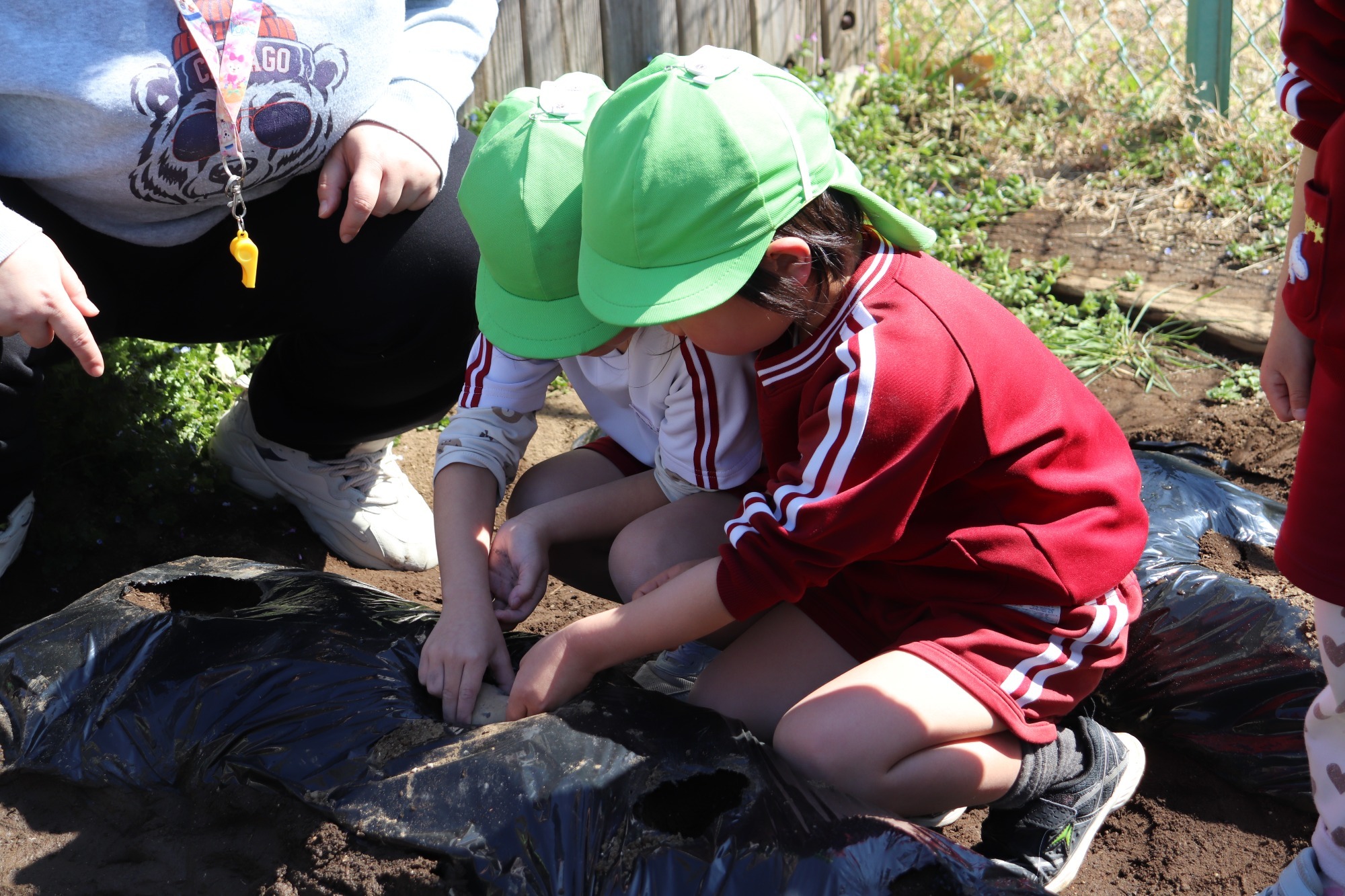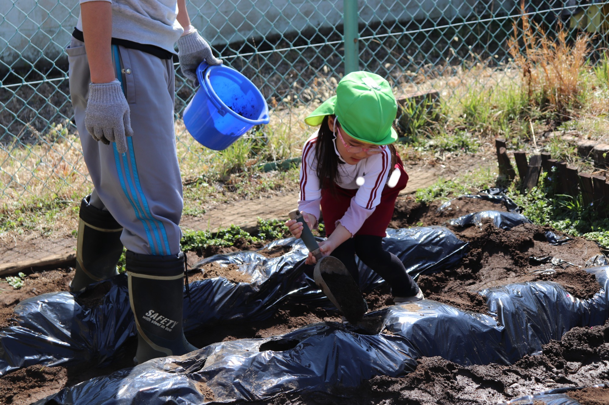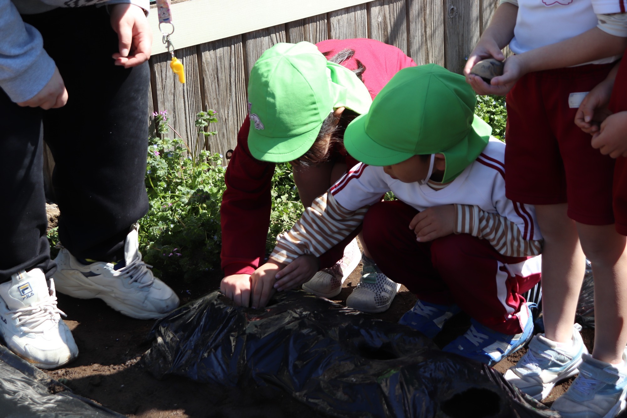 3月初旬に年長さんが種イモを植えてからあっという間に4か月が経ちました。たくさんの日差しを浴び青々と大きく茂った葉を眺めたり、大きくなっているかな~と心配したり、色々なお世話をみんなで頑張りながら育ててきました。7月になりいよいよじゃがいもの収穫時期です! 各クラスごと土の山を深く掘り進めると中から大きなじゃがいもが次々と顔を出します! 子どもたちは「あった~!!」と大興奮しながらたくさん収穫することができました!(^o^)! 種植えから収穫まで自分たちの手で育て、体験し、学びの多いじゃがいも作りとなりました!! 収穫したじゃがいもは美味しい給食になり、みんなでいただきました!!(^_-)-☆