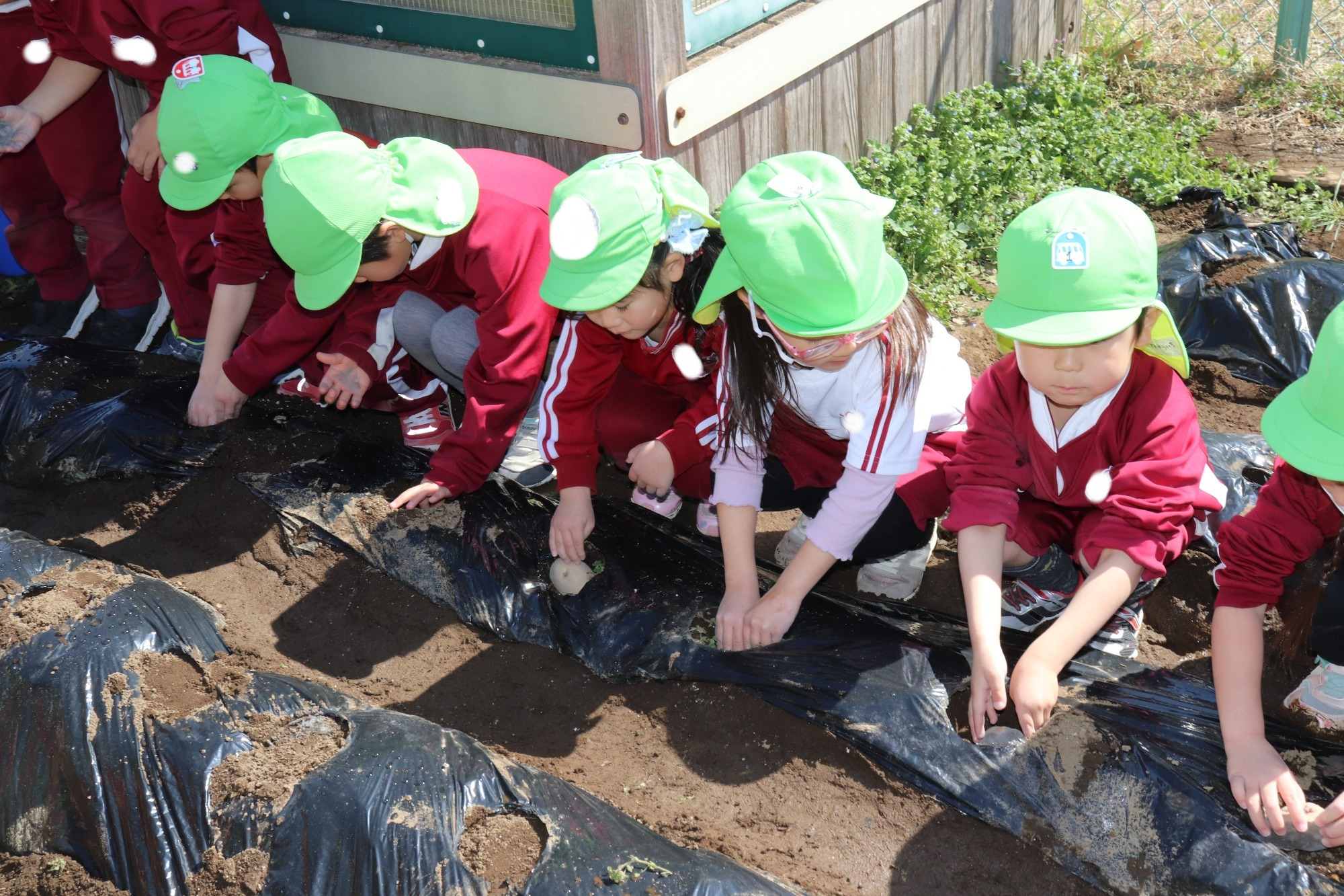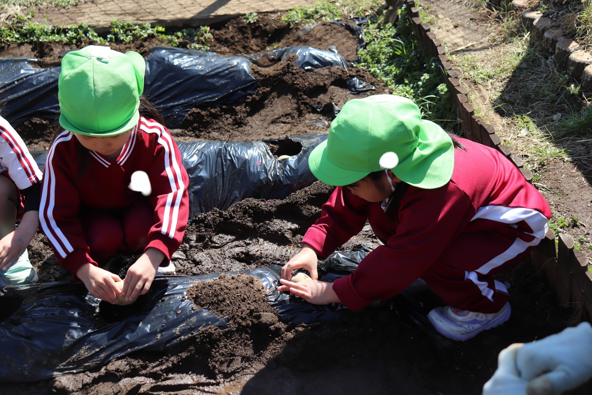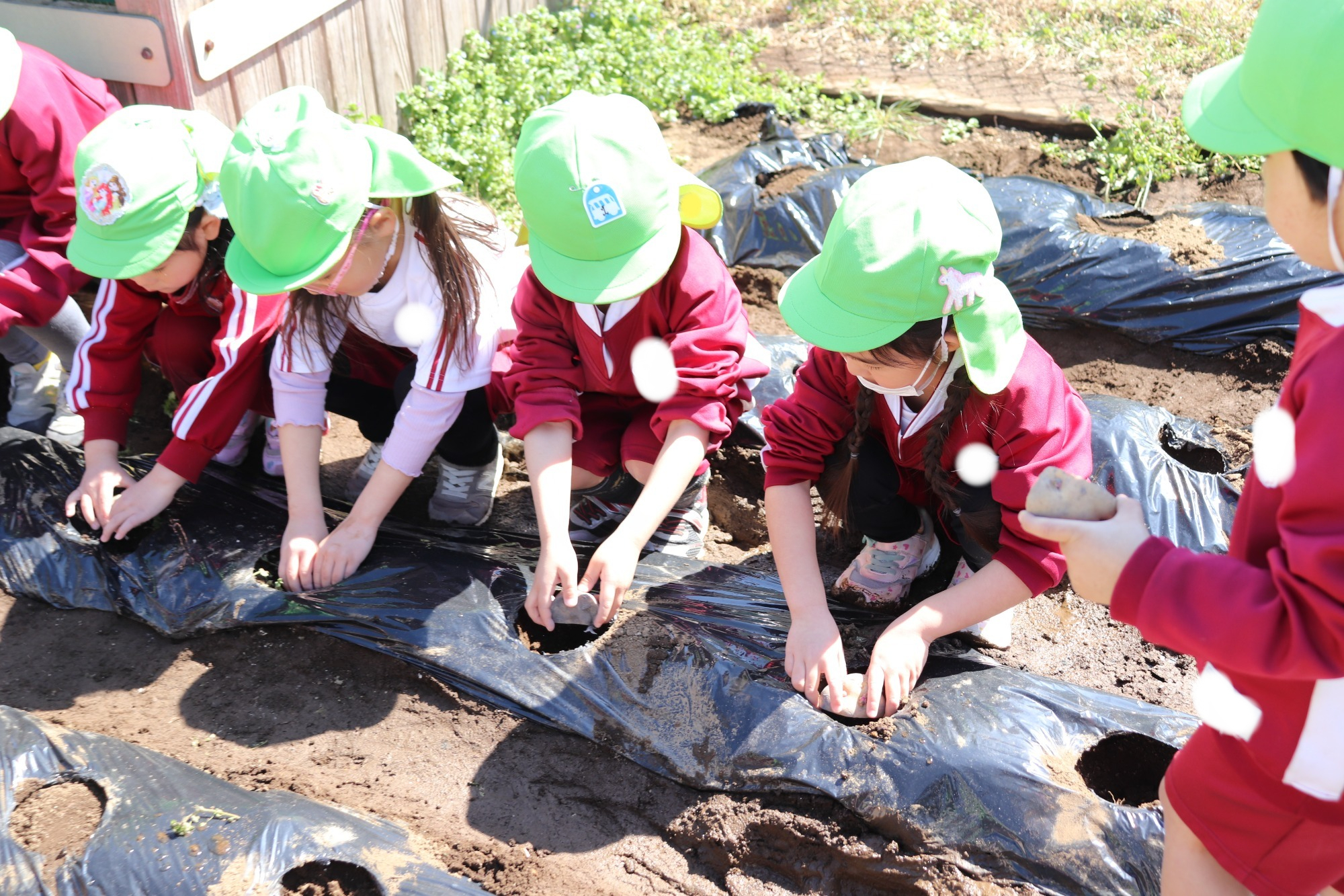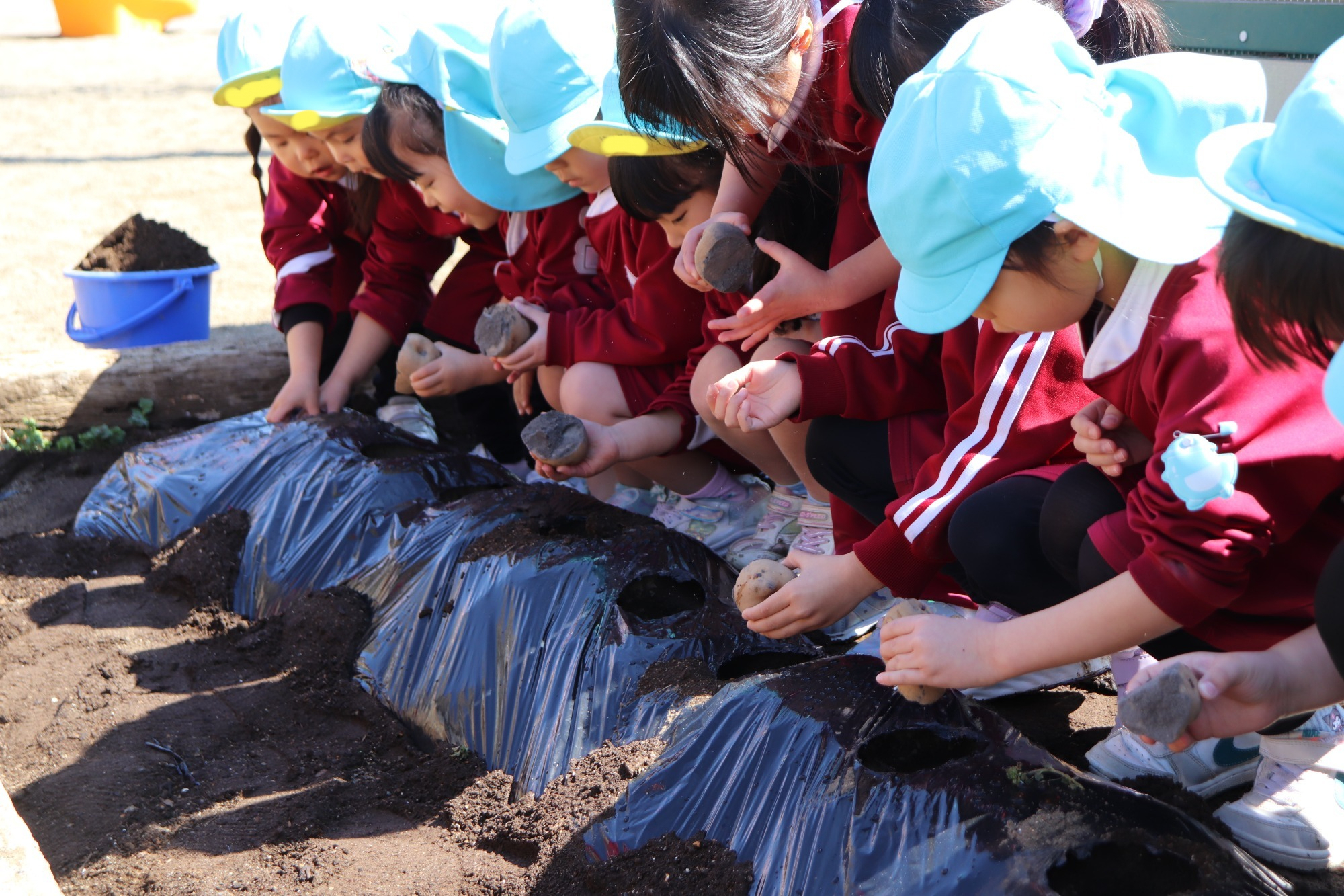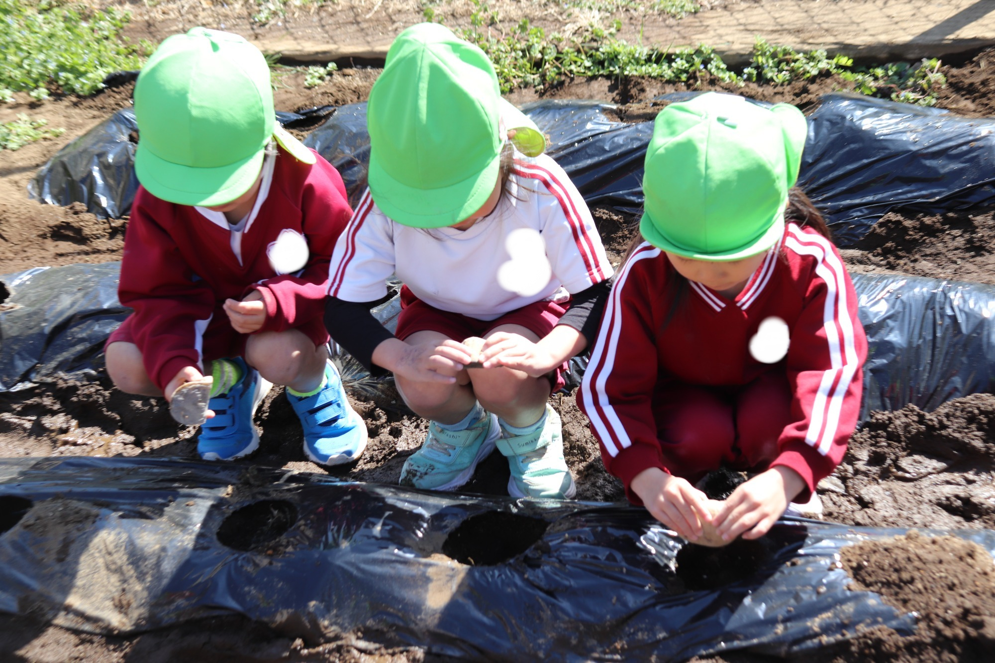 園では食育教育として季節の野菜を子どもたちと共に育てます。3月になり園庭の畑では年中さんたちがじゃがいの栽培を始めました。フカフカの土の上に子どもたちがじゃがいもの種イモを植え、大きく育つよう願いを込めました。年長さんへ進級しても引き続きじゃがいもの成長を観察し収穫までお世話してほしいと思います。どんなじゃがいもが出てくるかみんなで楽しみに育てましょう!!(^_^)v