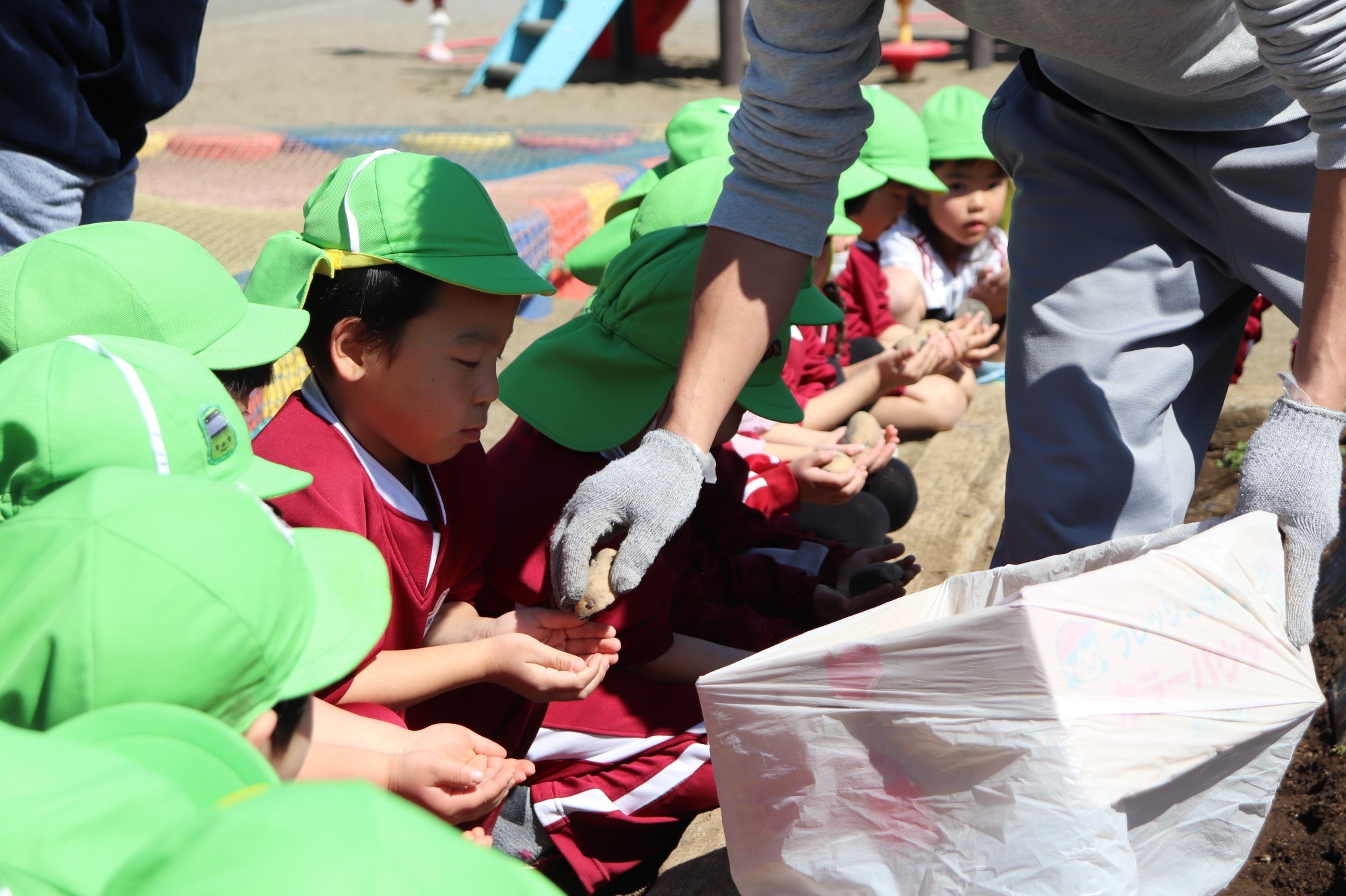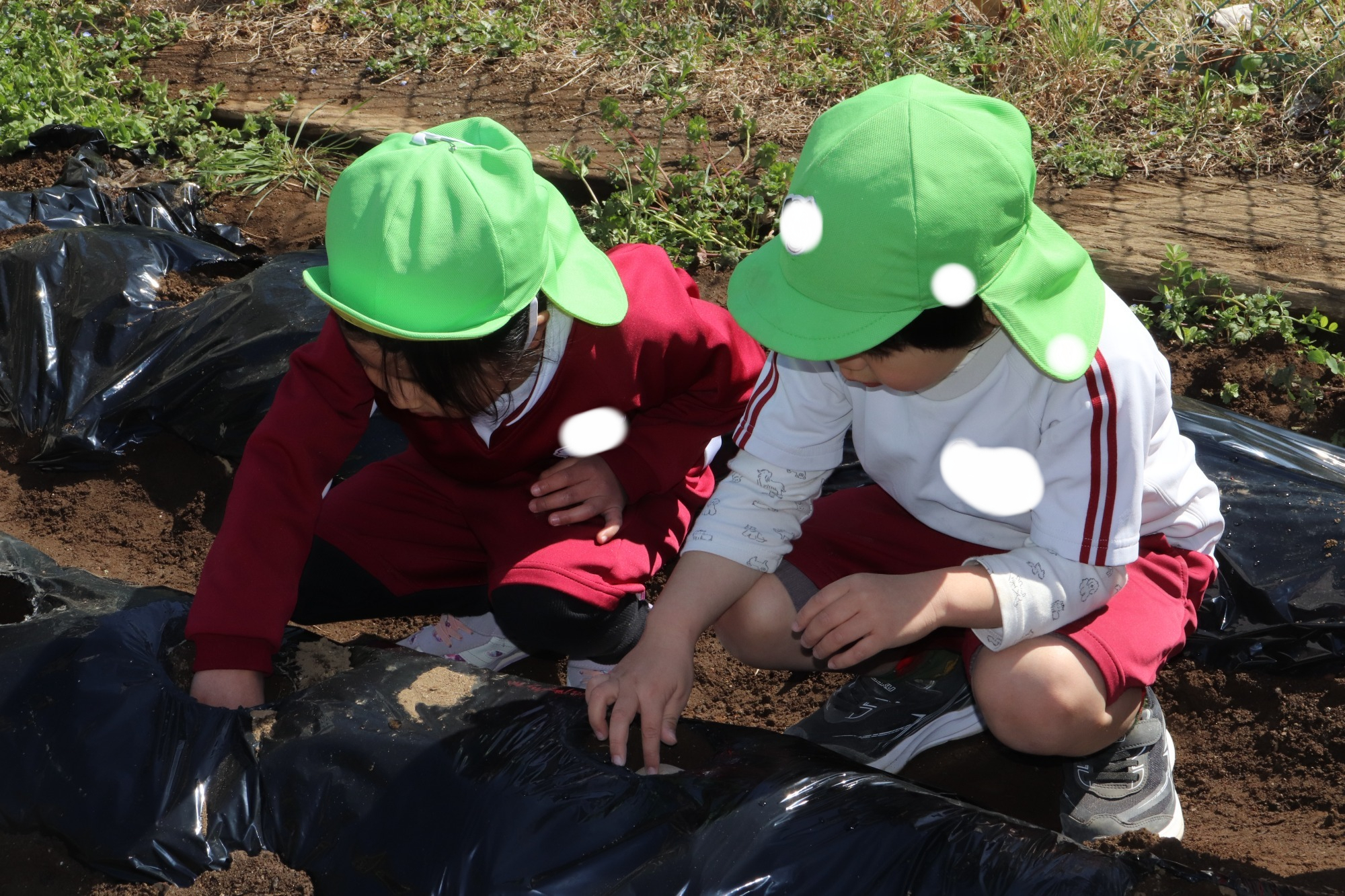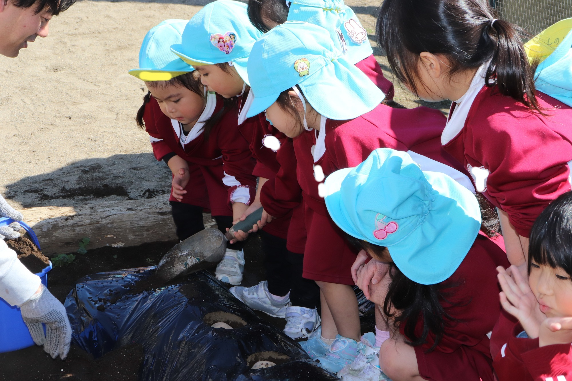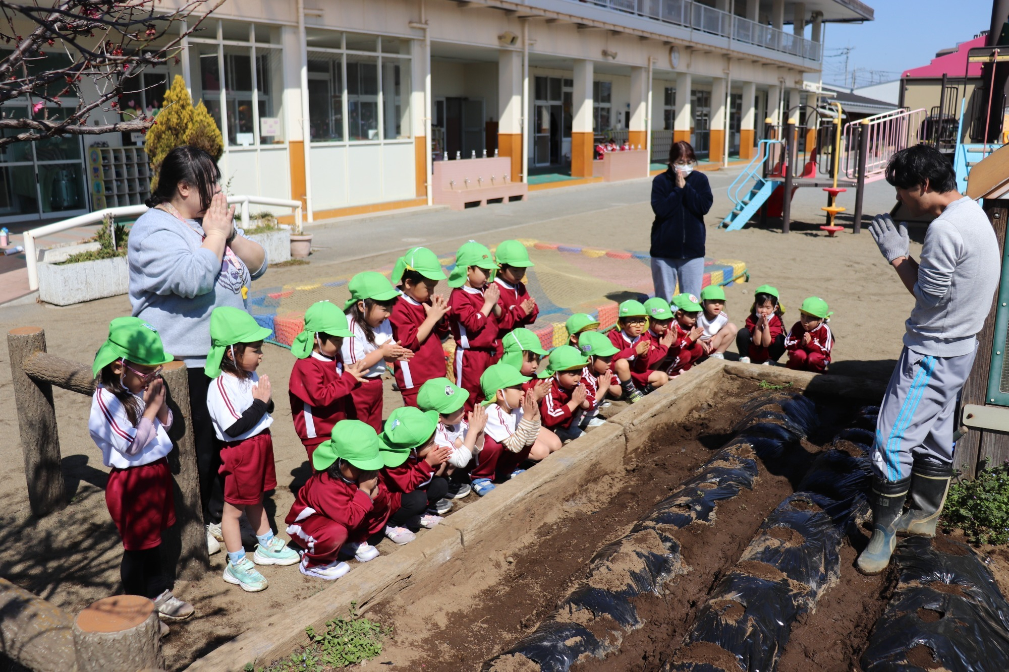 園では食育教育として季節の野菜を子どもたちと共に育てます。3月になり園庭の畑では年中さんたちがじゃがいの栽培を始めました。フカフカの土の上に子どもたちがじゃがいもの種イモを植え、大きく育つよう願いを込めました。年長さんへ進級しても引き続きじゃがいもの成長を観察し収穫までお世話してほしいと思います。どんなじゃがいもが出てくるかみんなで楽しみに育てましょう!!(^_^)v