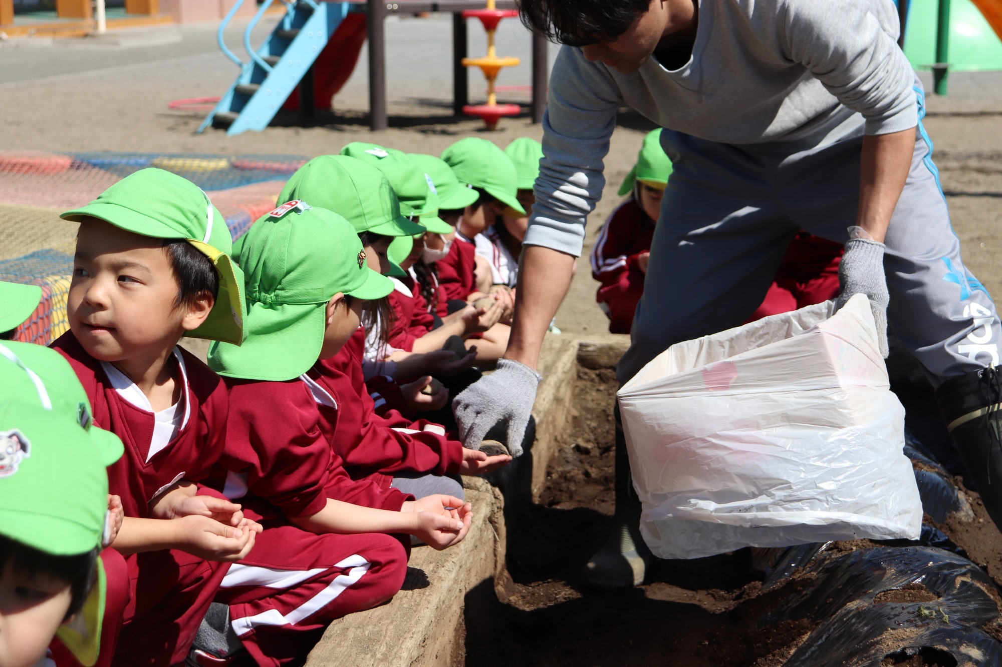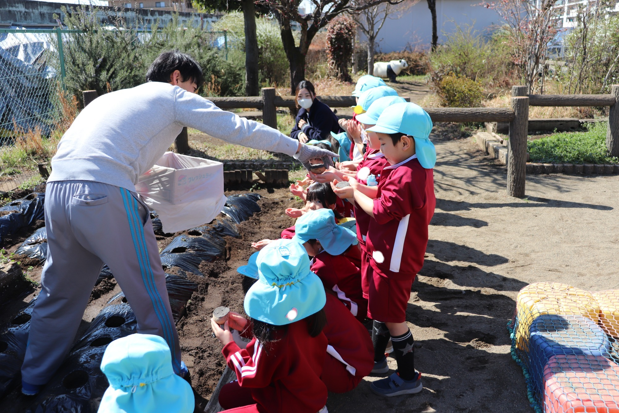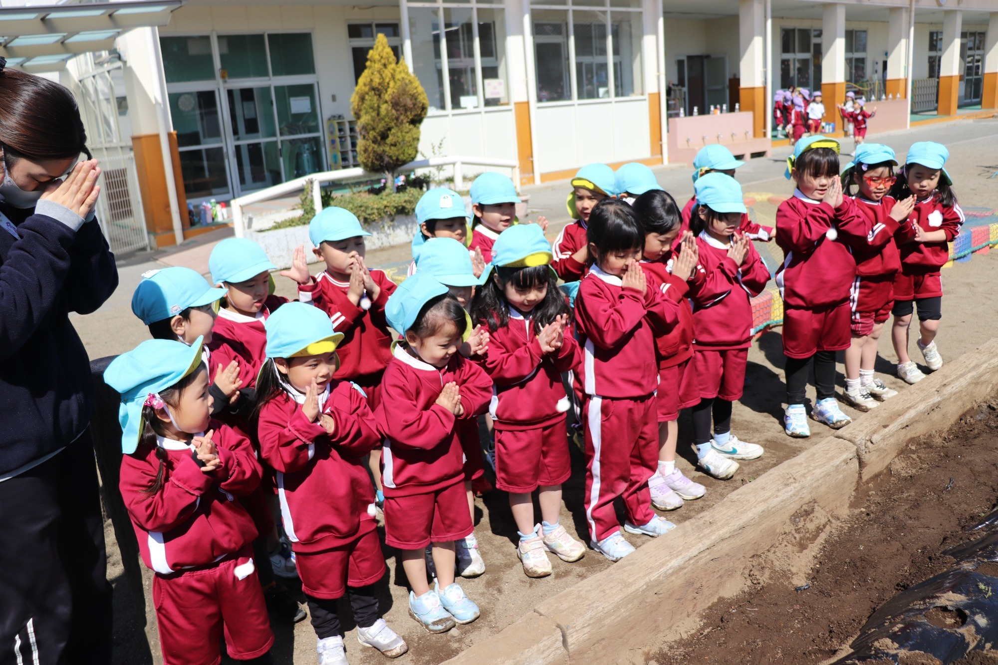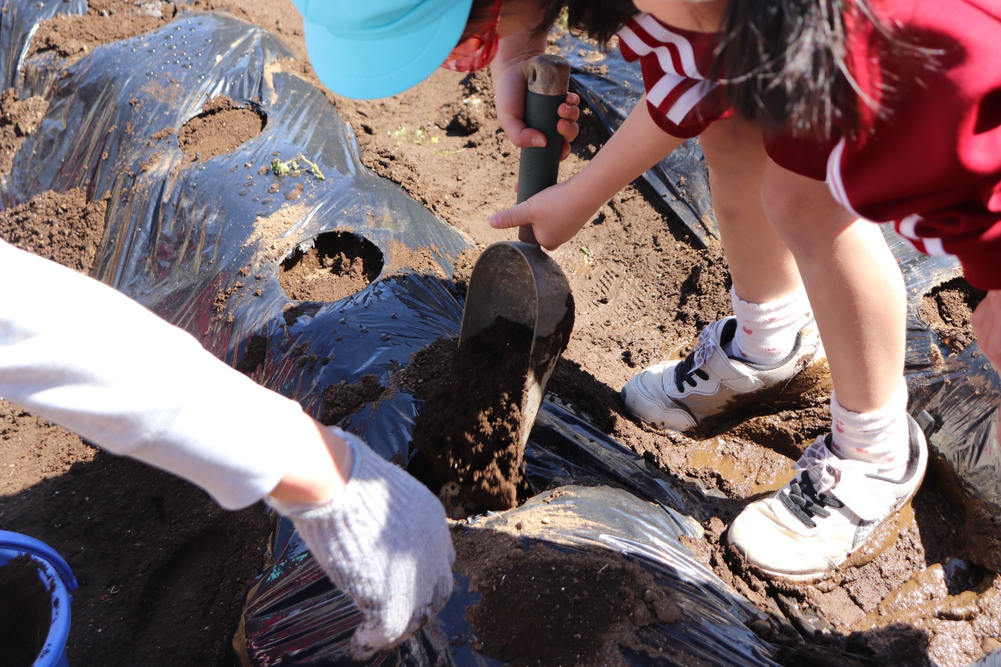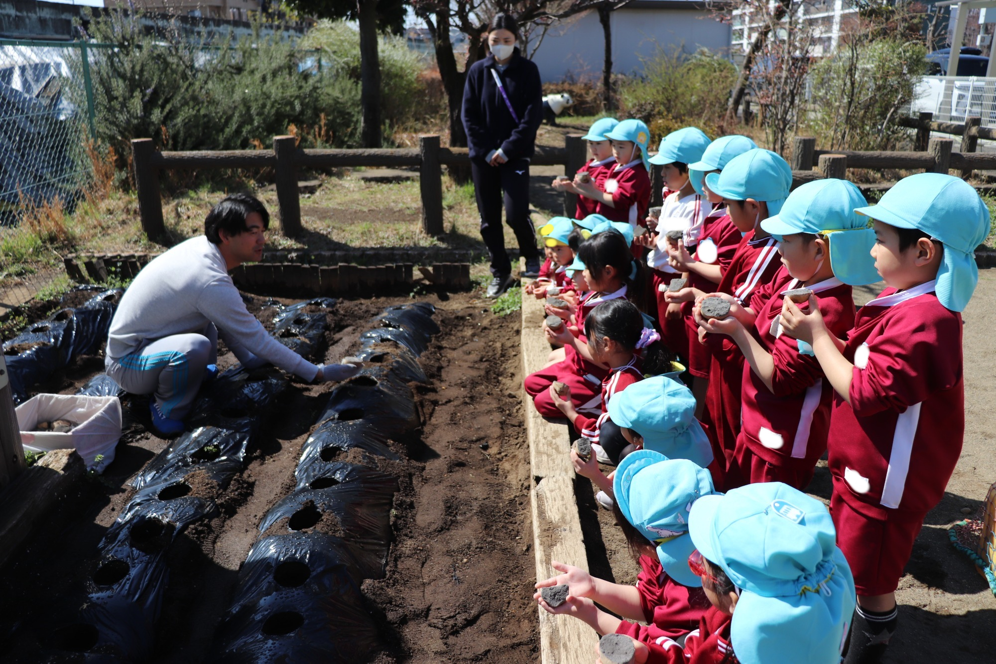 園では食育教育として季節の野菜を子どもたちと共に育てます。3月になり園庭の畑では年中さんたちがじゃがいの栽培を始めました。フカフカの土の上に子どもたちがじゃがいもの種イモを植え、大きく育つよう願いを込めました。年長さんへ進級しても引き続きじゃがいもの成長を観察し収穫までお世話してほしいと思います。どんなじゃがいもが出てくるかみんなで楽しみに育てましょう!!(^_^)v