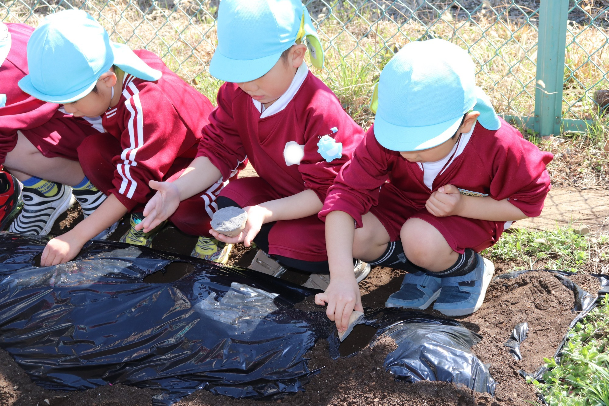 運動会や日常の保育中にケガなどしないように先生と子どもたちが全員協力して園庭の石拾いをしました! 安心して走ったり遊んだりしようね!